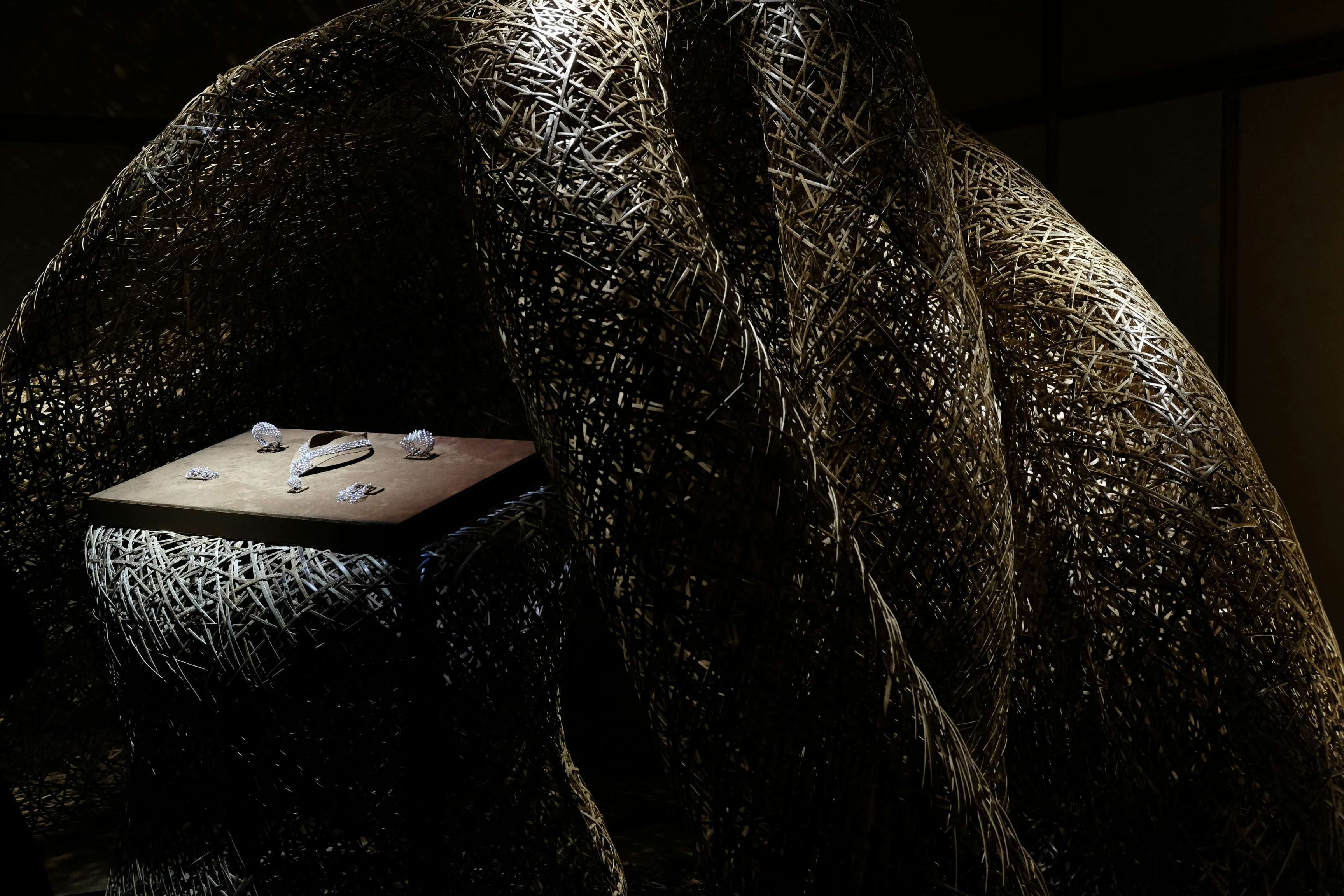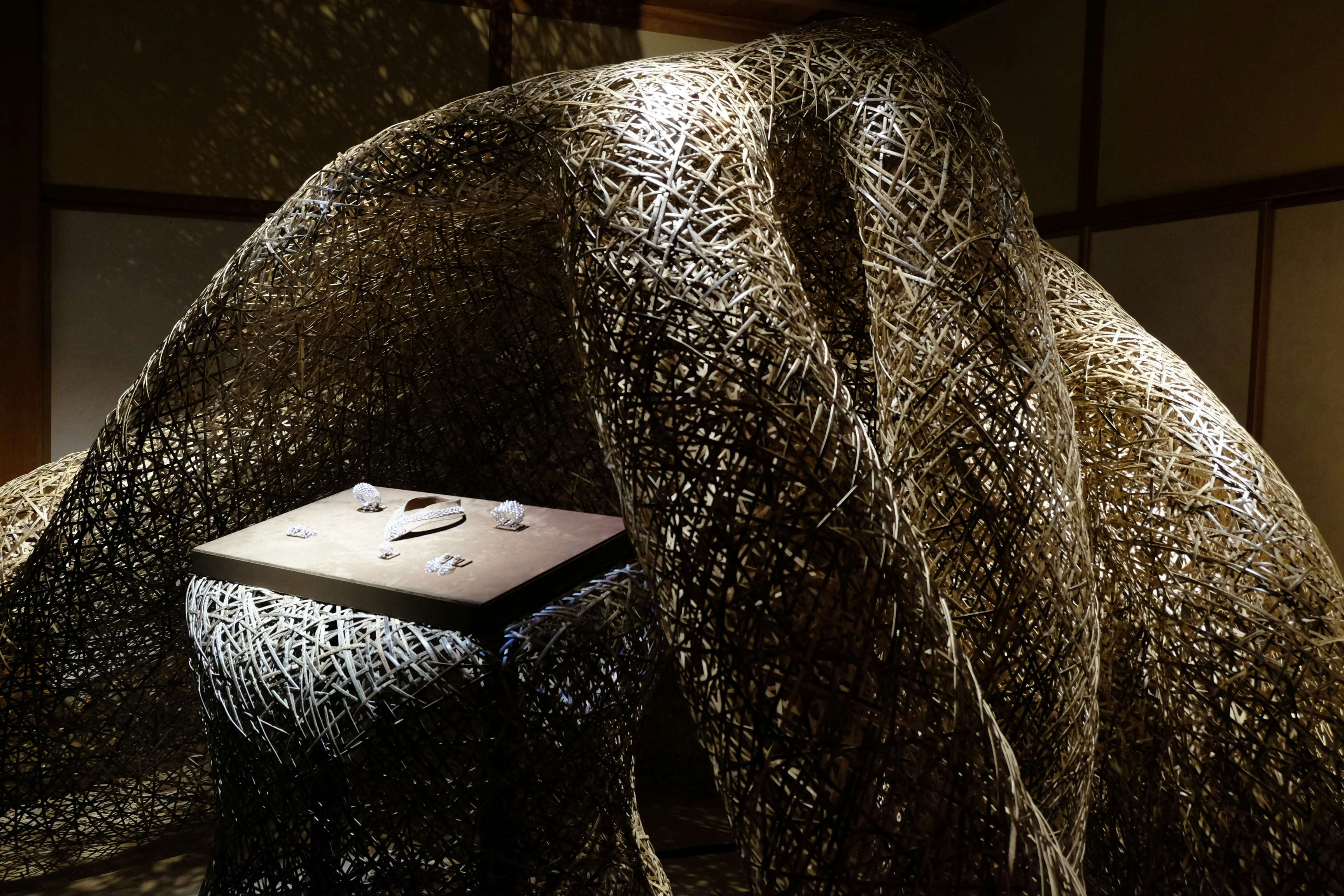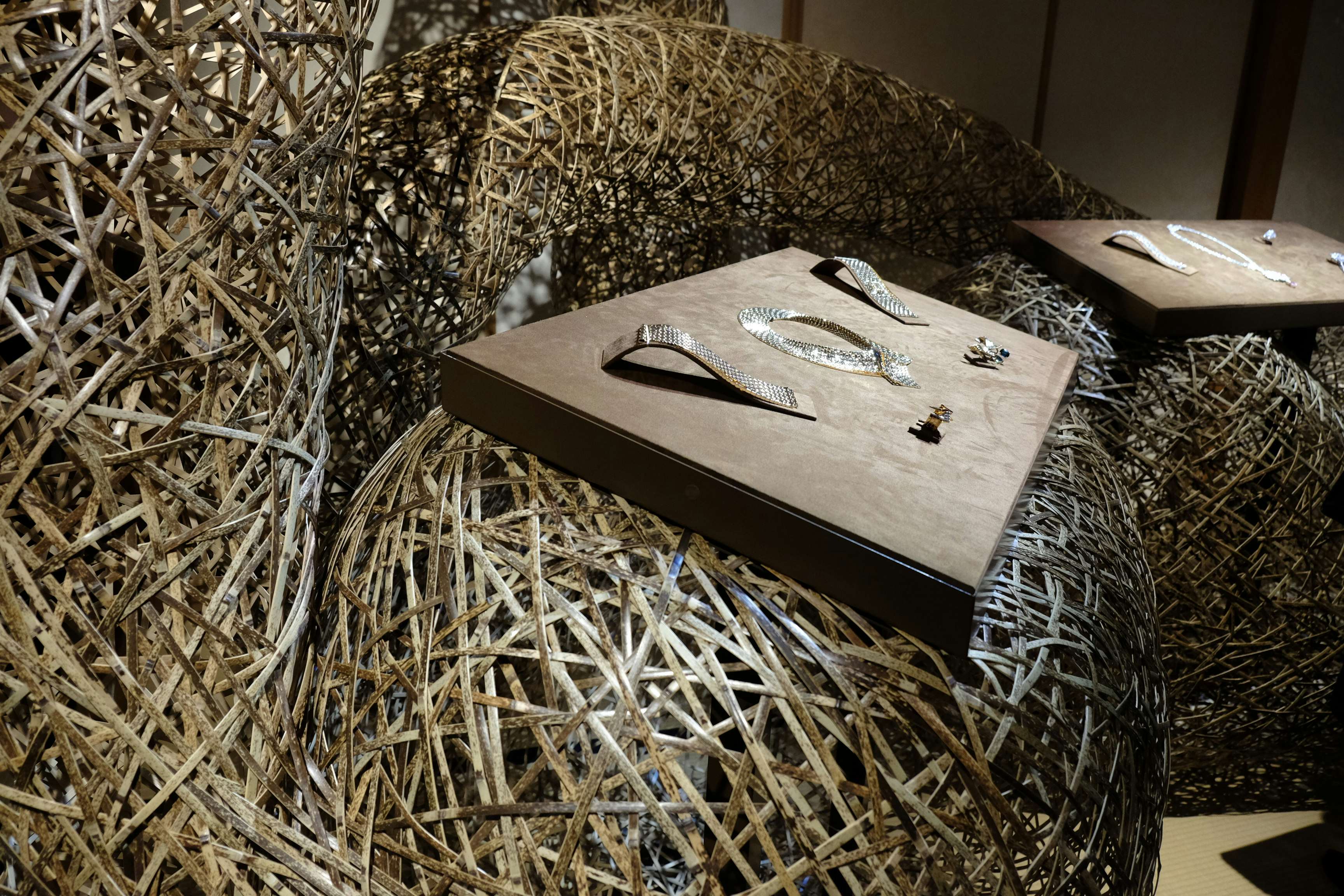 展示風景より、四代 田辺竹雲斎の展示とショーメのジュエリー
