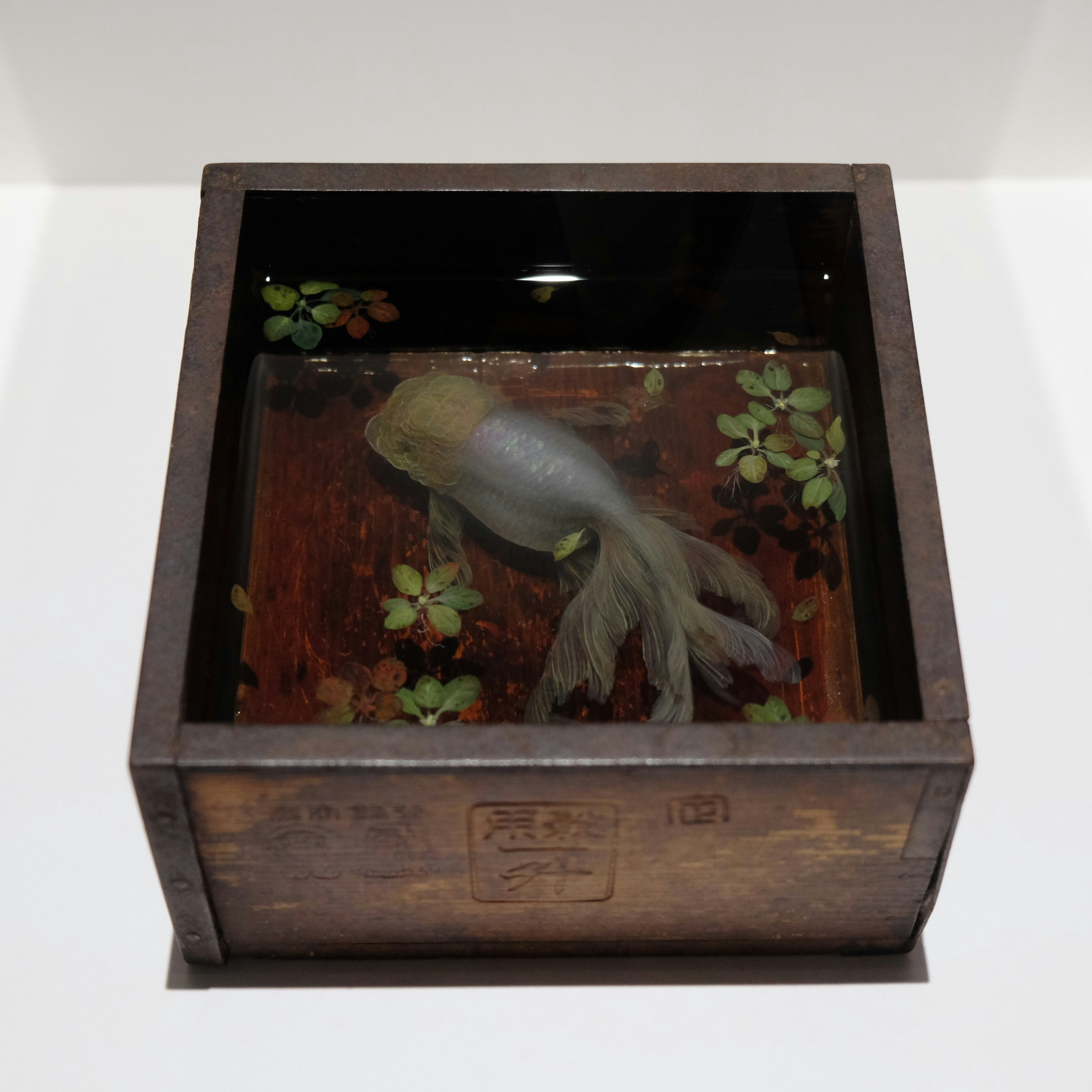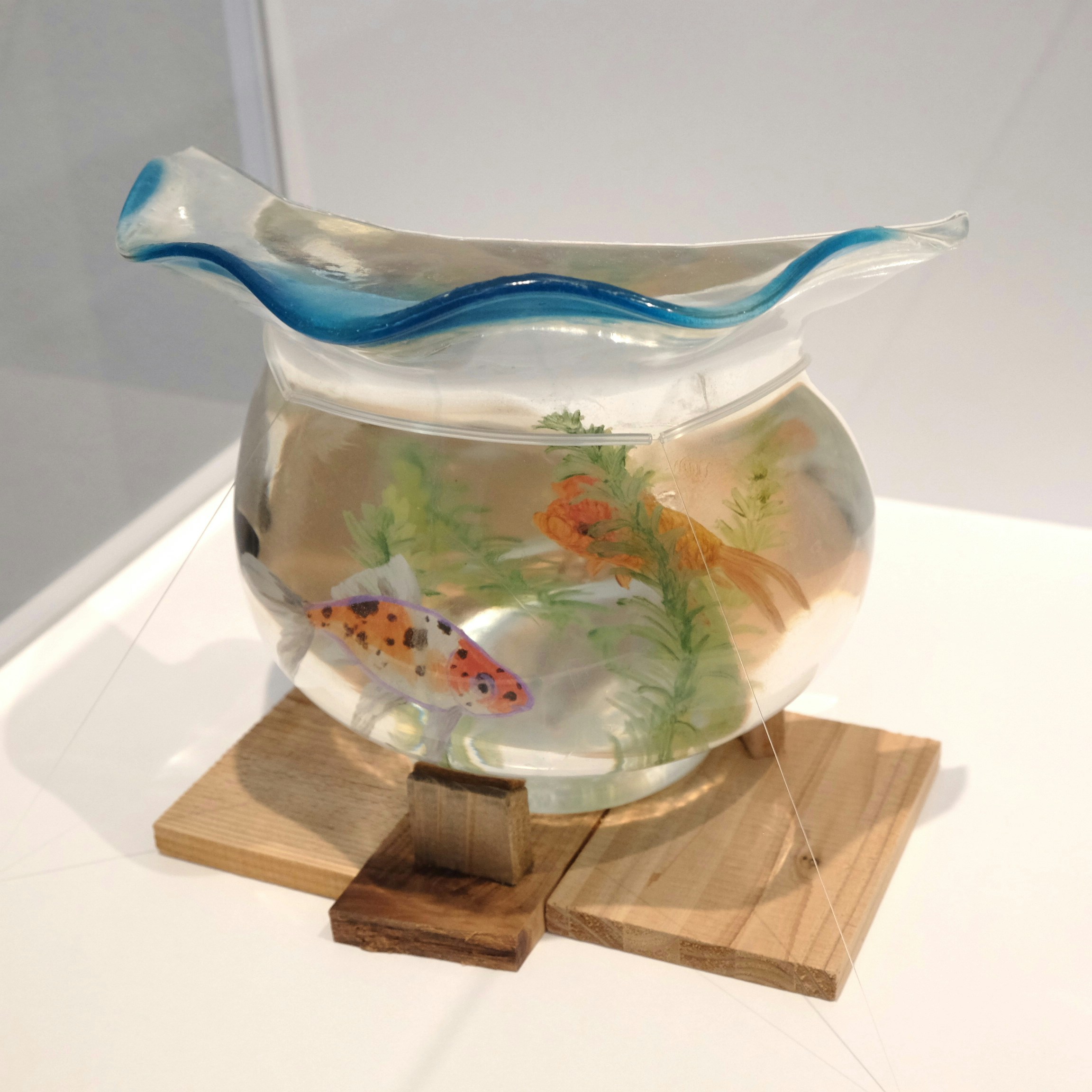 とくに00年代初頭から現在にいたるまで一貫して制作を続けている、一合枡に金魚が泳ぐ作品シリーズ「金魚酒」の歴代作品が並ぶ様は圧巻だ。同一の構成要素で制作されるがゆえに、深堀が樹脂と格闘してきた20年近い歳月の鍛錬の蓄積を見て取ることができるだろう。