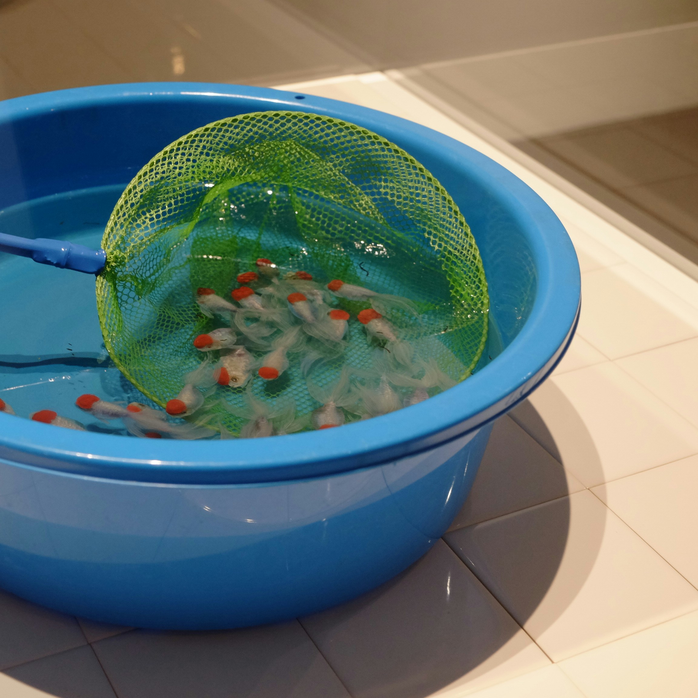 また、展覧会の最後に用意されたインスタレーション《僕の金魚園》(2021)は、見る者に大きなインパクトを与えるだろう。展示室に設置された本物そっくりの金魚の屋台。そのなかにはキャラクターのように平面化された金魚たちが泳いでいる。いっぽうで、壁面には水中の光のようなライトが投影され、金魚の水槽を覗き込むとともに、まるで鑑賞者も水槽のなかにいるような演出がなされている。