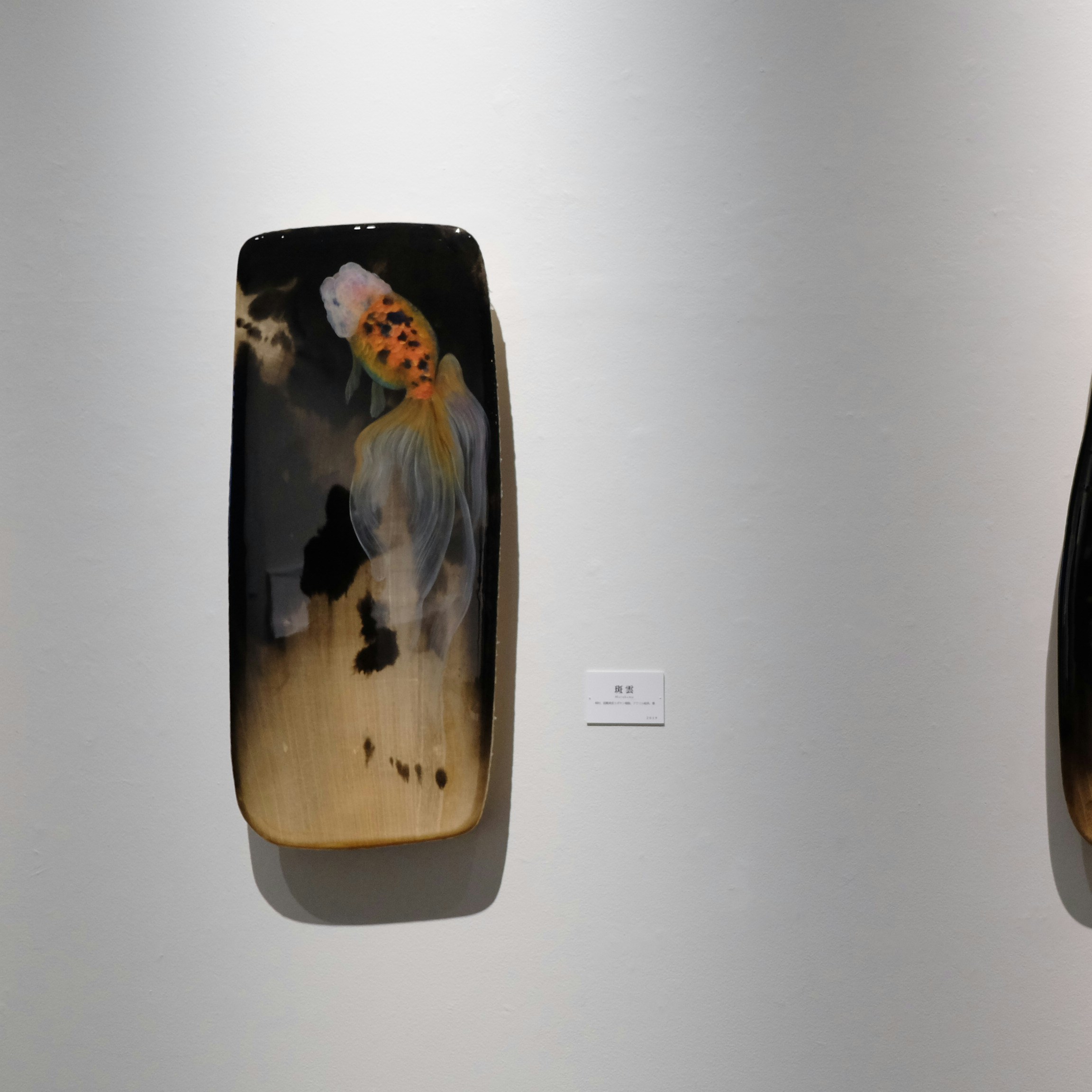 第4章「遍在する金魚たち2─支持体、形式の探求」では、様々な素材に金魚を描く深堀の制作のなかでも、とくに日常生活にあるものを支持体にした作品が並ぶ。