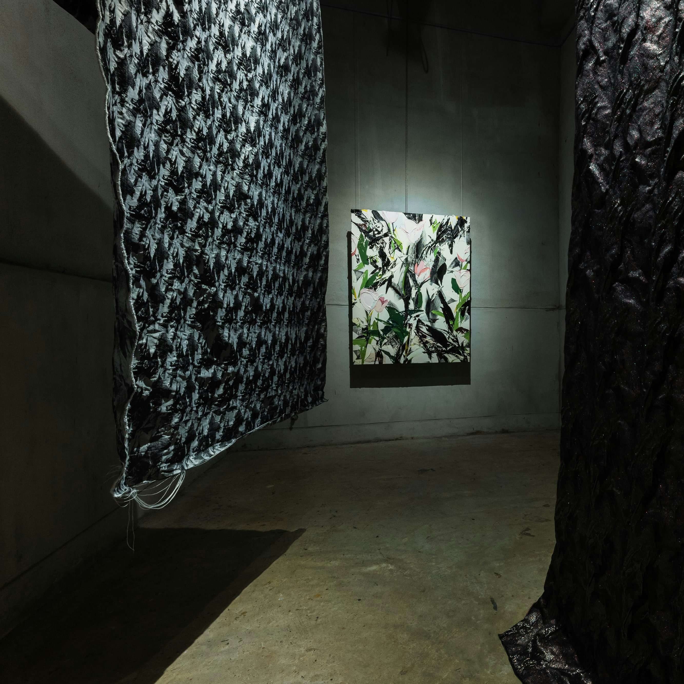 もっとも小さな空間にありながら、みごとな作品に昇華させたのが児玉のインスタレーションだ。自身が身にまといたいと思うほど魅了される植物の魅力を、絵具というマチエール、色、かたちで絵画に存在させようとする彼女が今回挑んだのは、自身の絵画作品を素材とした新たな光の布の制作。植物の生命力を感じさせる彼女の作品の勢い、絵具の盛り上がりや質感、画面に生まれるリズムからインスピレーションを得たこの地の機屋が制作した織物は、絵画と通底しつつオリジナルの輝きを放つ。絵と布、互いに主従を無化して拮抗し、共鳴する空間は必見だ。