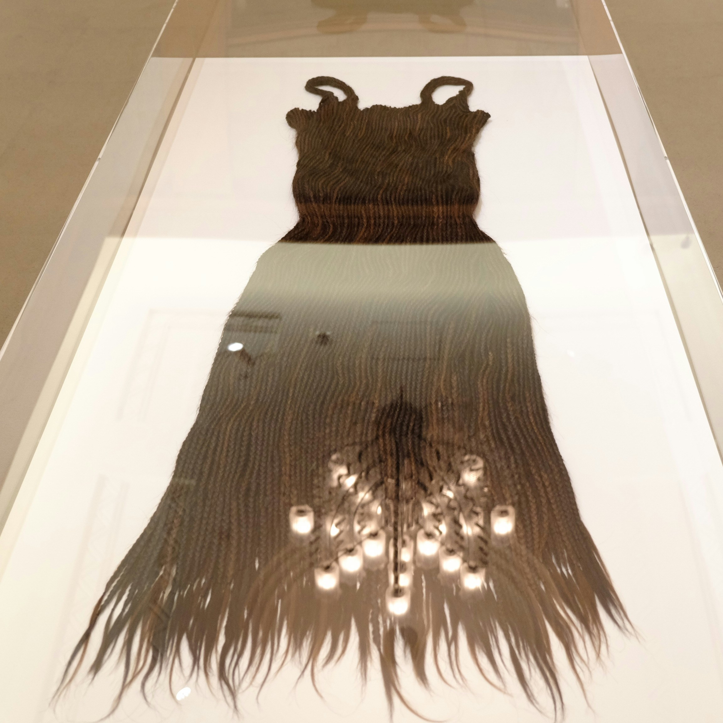 第3章「髪(ヘアー)へと向かう、狂気の愛」では、人体の一部である髪をジュエリーに組み込んだものや、モードの文脈に引きつけたドレスを展示。故人の髪の毛が収められたペンダントトップや、小谷元彦の三つ編みの髪を使ったドレス、マルタン・マルジェラによる頭髪のプリントドレスなどで、マテリアルとしての髪の扱われ方をたどる。