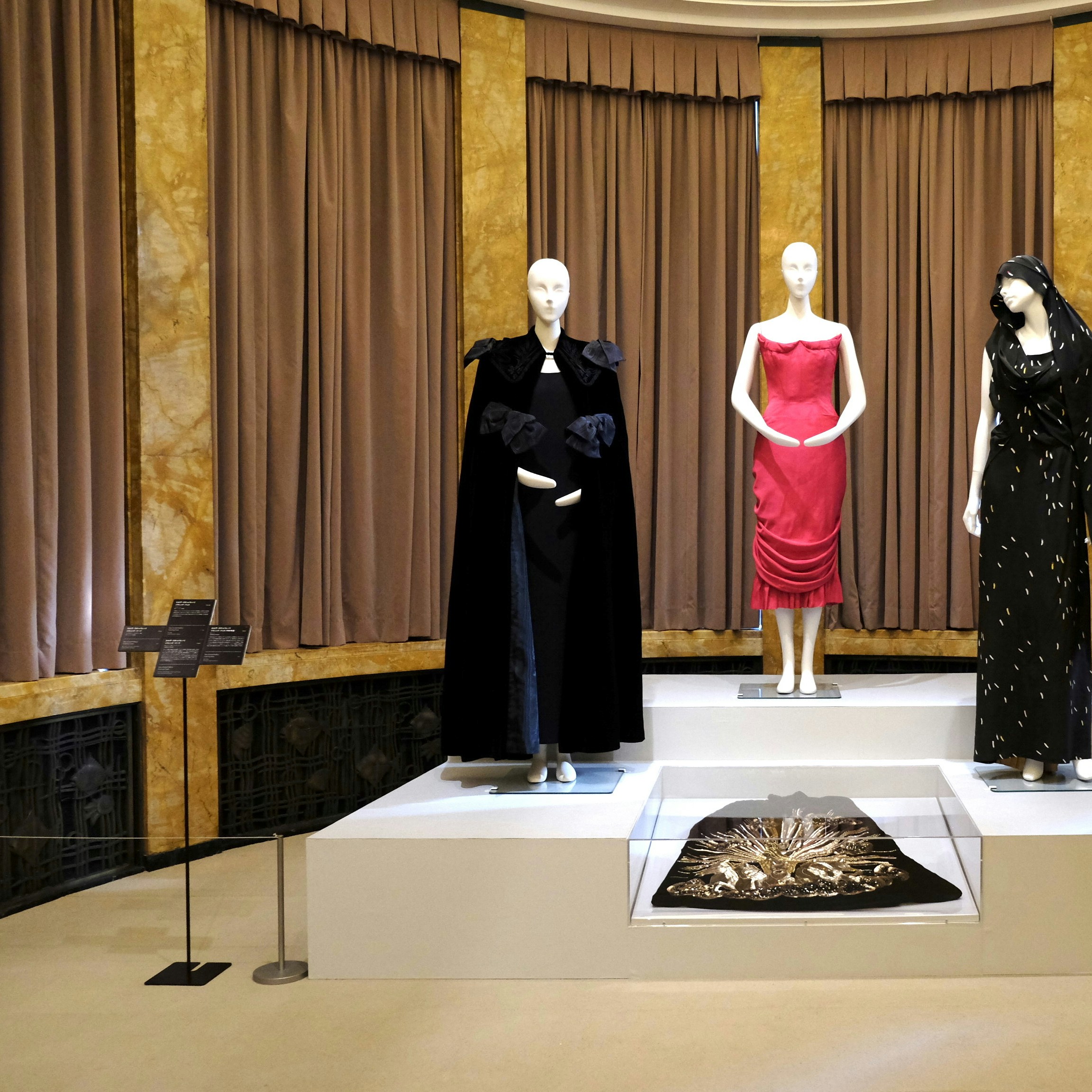 展示では奇想天外な香水瓶やクリスチャン・ベラールが手がけたデザイン画をきらびやかな刺繍で表現したイヴニング・ケープや、色とりどりのマッチ柄を採用したイヴニング・ドレスなど、奇想のアイデアがつまった服の数々を目にすることが可能だ。