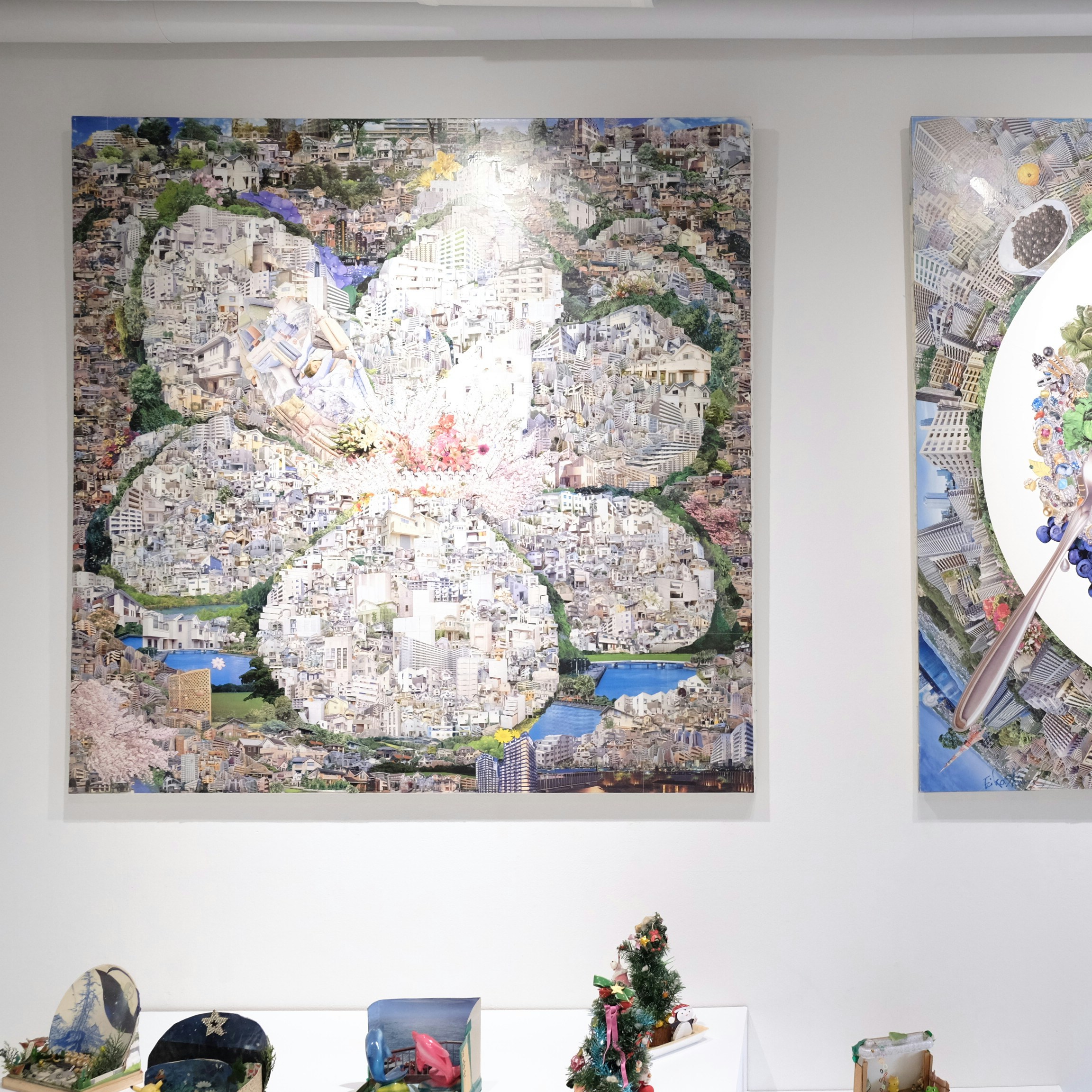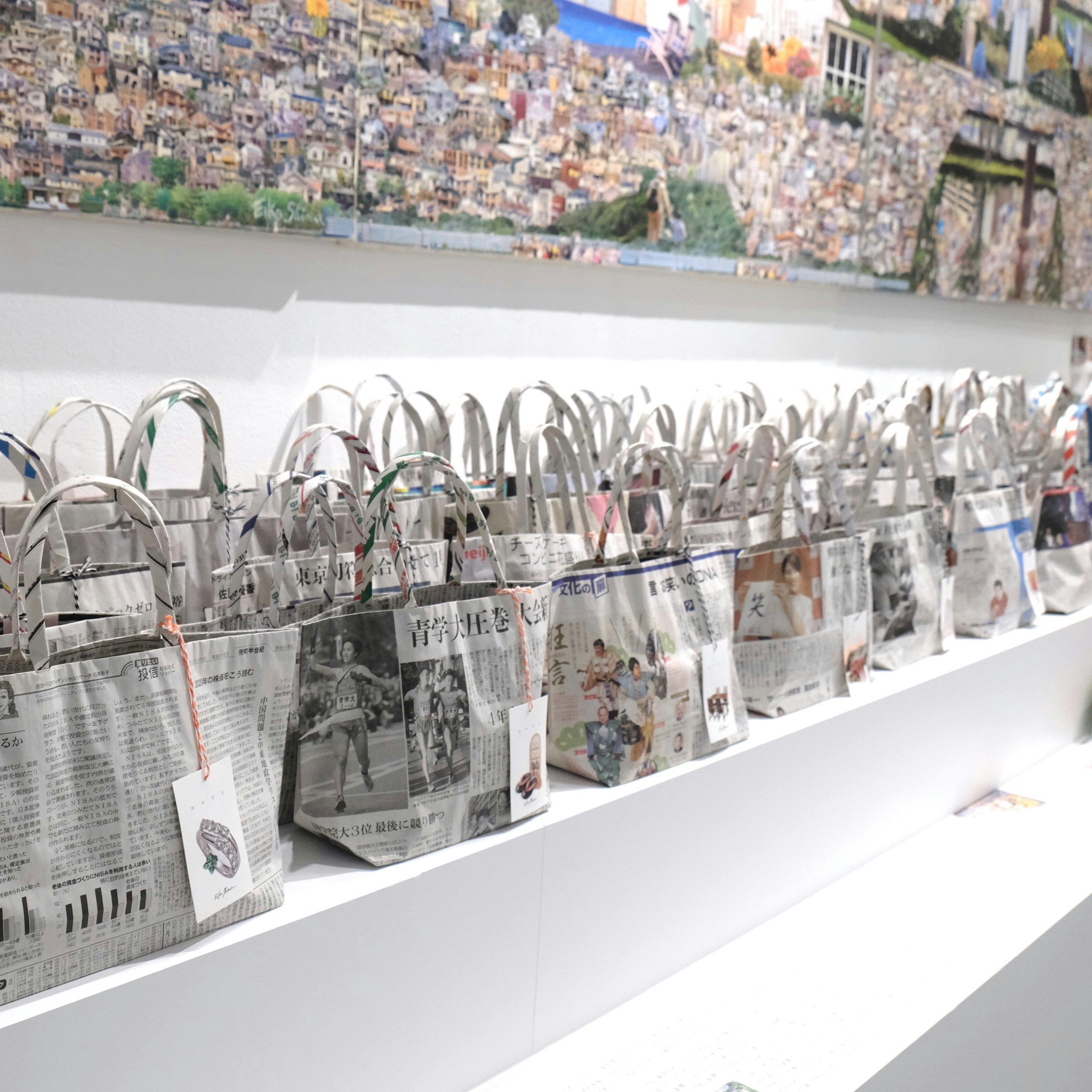 嶋は1943年生まれで、昨年10月の世田谷美術館分館での新聞紙バックの展示でも話題を集めたつくり手だ。新聞の写真や広告を表面にするなど、ビジュアル的な面を意識したバッグ群もさることながら、見るものに強いインパクトを与えるのが巨大なコラージュ作品だ。キャンバスに無数の広告チラシの切り抜きを貼ることでつくられたこの平面作品は、家族が寝た家で粛々と制作が進められていったという。これほどの大作が人知れずつくられていたことは驚異的といえるだろう。