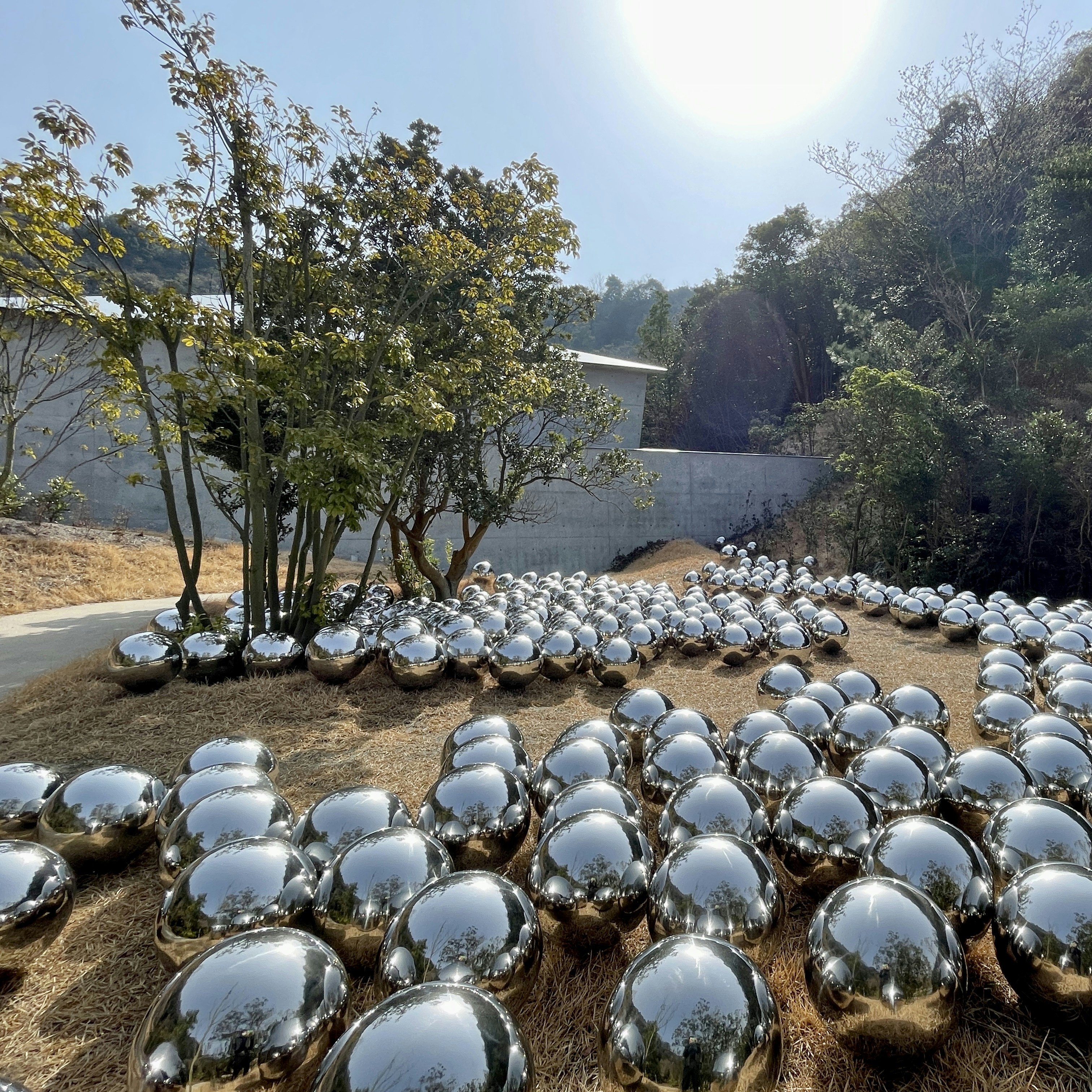 建築の屋内外に展示される《ナルシスの庭》(1966/2022)は、草間彌生が1966年のヴェネチア・ビエンナーレでパビリオン外の芝生に大量のミラーボールを敷き詰め、世界的注目を集めるようになったモニュメンタルな作品。発表されて以来、世界中の様々な場所で展示されてきた同作だが、今回は合計約1700個の球体を建築のなかだけでなく、自然の芝生と池の上にも同時に展示した初の試みとなる。水面に浮かぶ金属球は風に乗って優しくぶつかり合い、軽快な音を立てる。