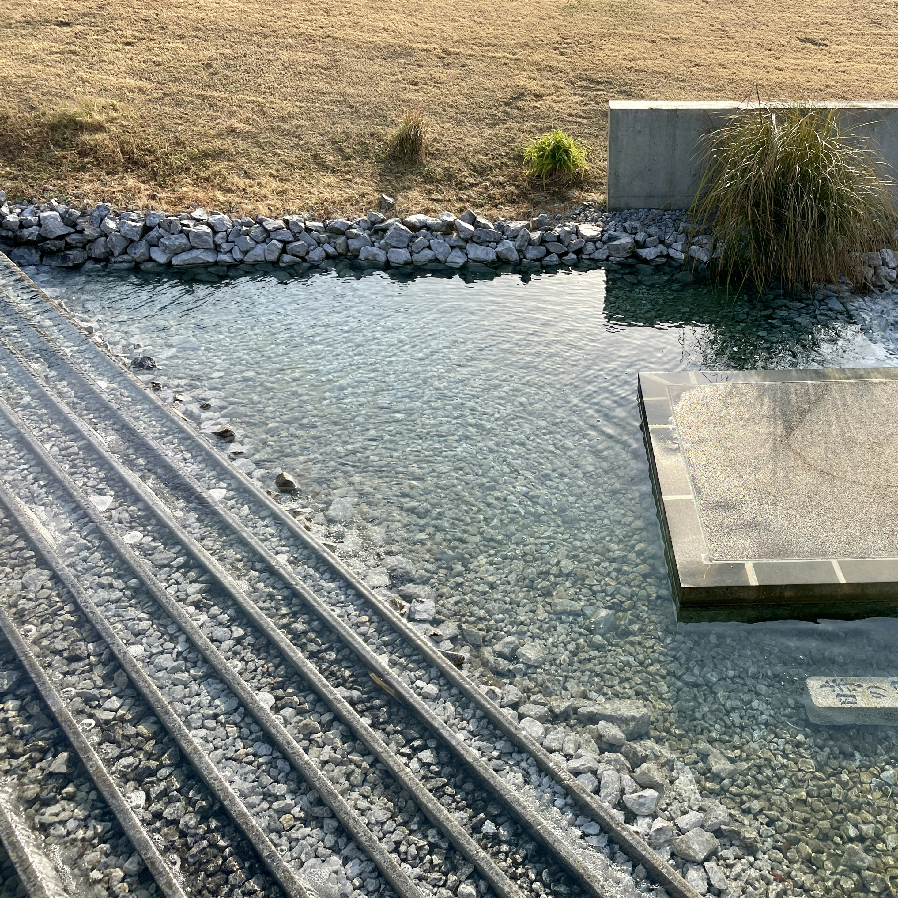 今回の整備にあたり、仏像の周囲に豊島石が敷き詰められており、鑑賞者は石を拾い、池の畔の反対側にある巨石周辺で積石を行うことができる。三木は、「原始自然信仰やものづくりの原型、自然の循環などを感じさせる積石は、ある種参拝のような手順を想起させ、人々の静かな参加を誘う」と話す。