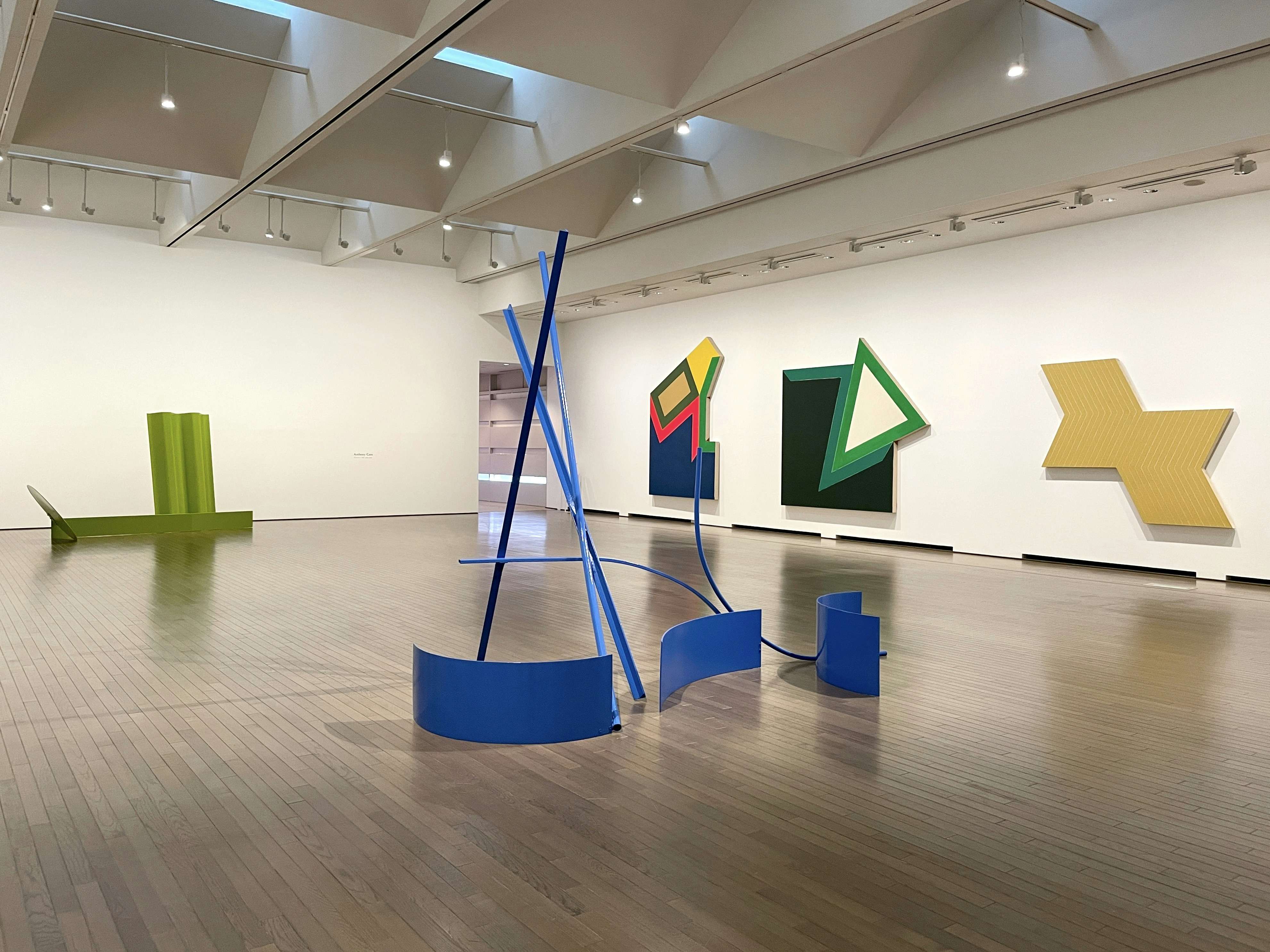 第1章の展示風景より、手前はアンソニー・カロ《交差》(1965)。壁面は右からフランク・ステラ《デード・シティ》(1963)《モールトンボローⅡ》《モールトンヴィルⅡ》(ともに1966)、アンソニー・カロ《原初の光》(1966)