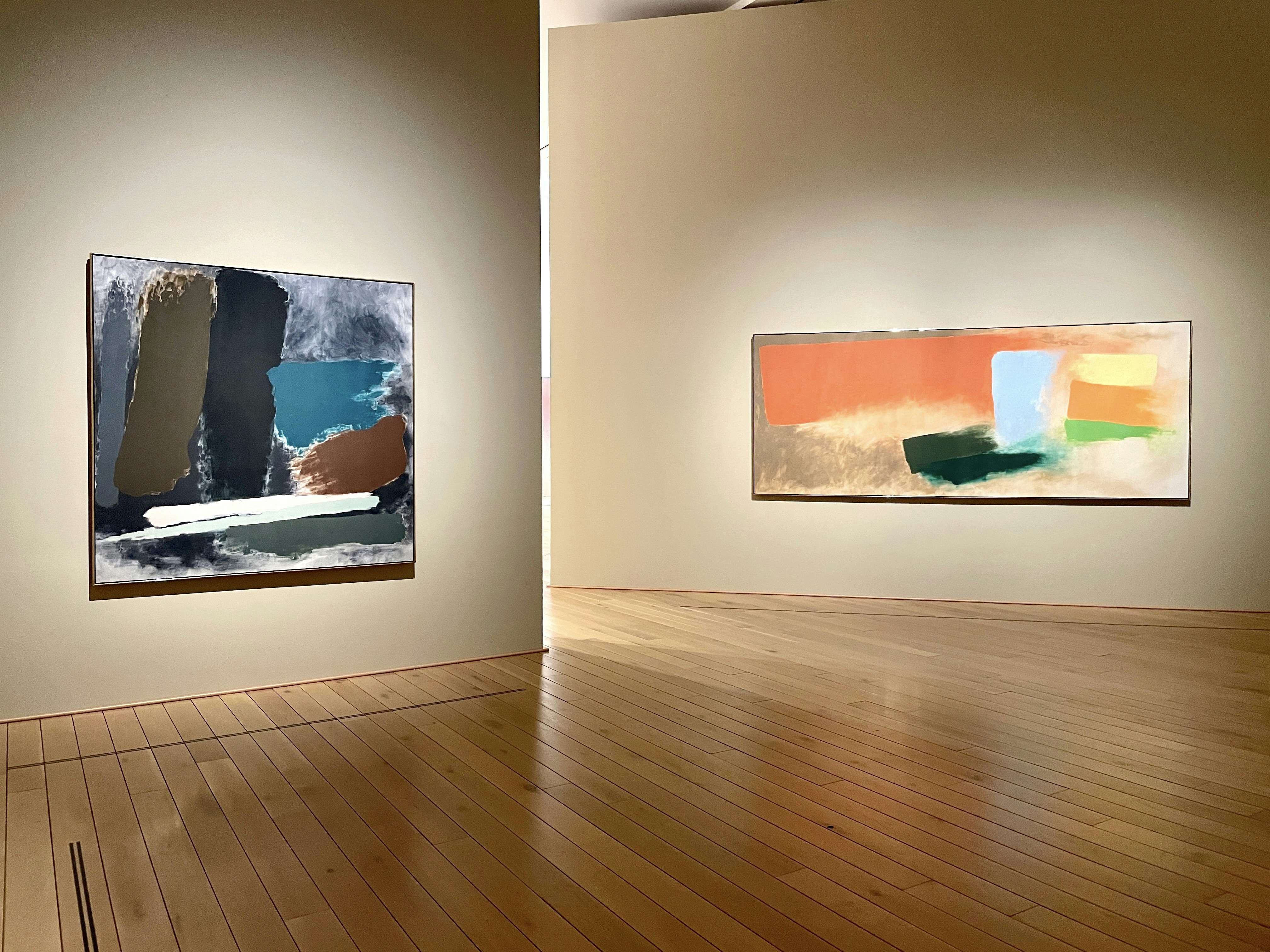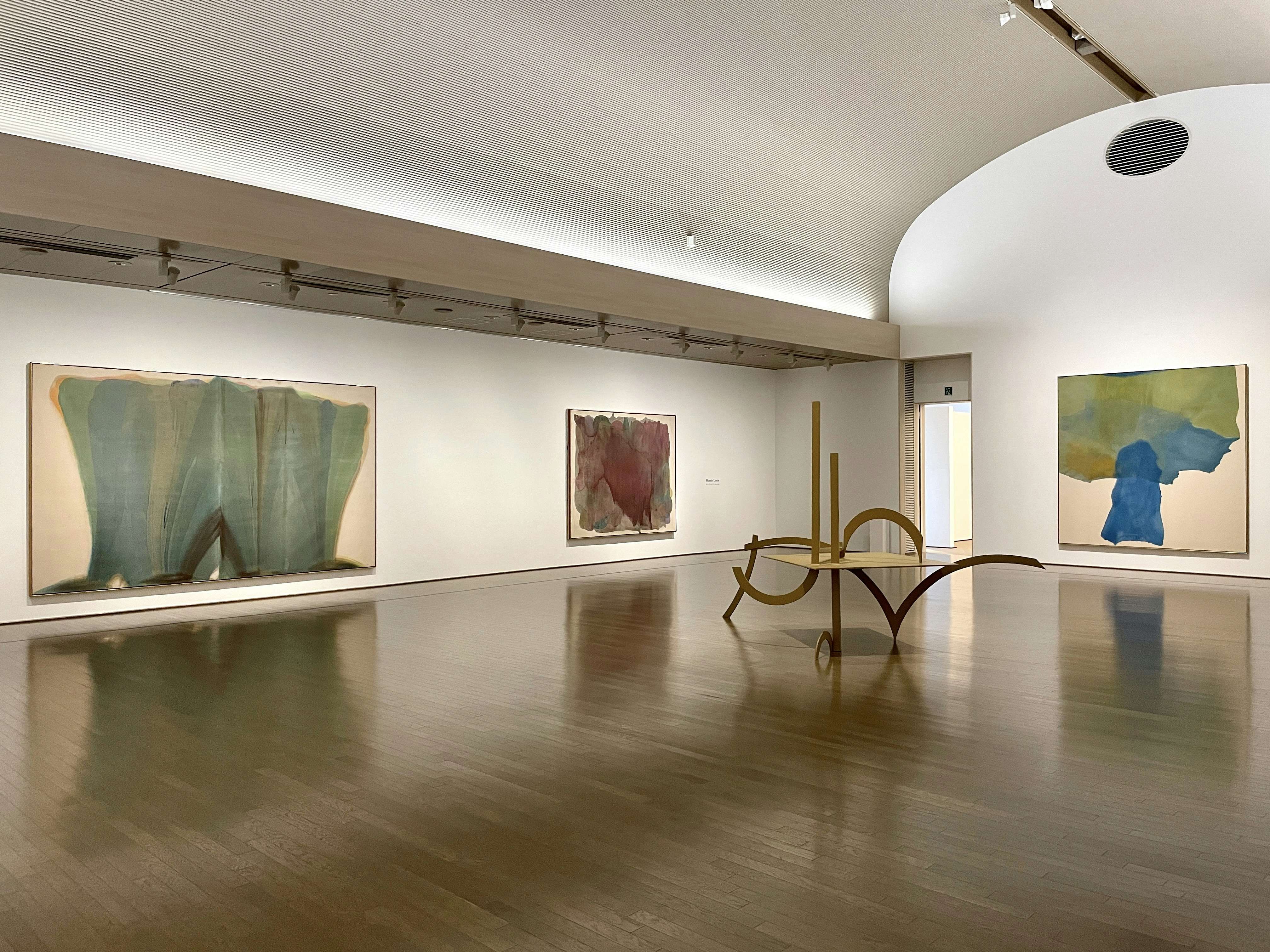 第2章の展示風景より、左からモーリス・ルイス《ギメル》(1958)《広がり》(1954)、アンソニー・カロ《三つ葉》(1968)、ヘレン・フランケンサーラ―《シグナル》(1969)