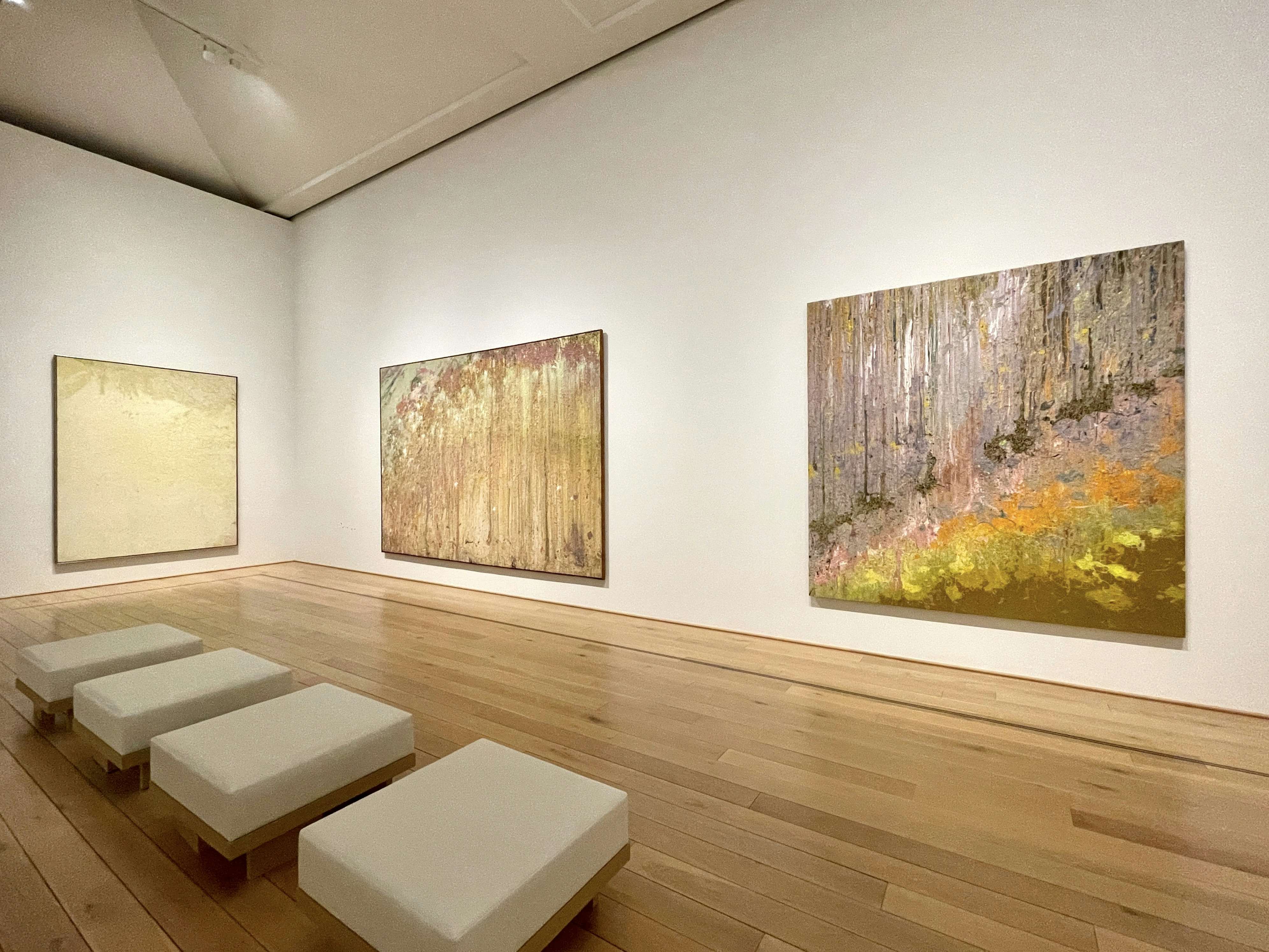 第2章の展示風景より、右からラリー・プーンズ《大いなる紫》《雨のレース》(ともに1972)《ミネソタのリップル川》(1970)
