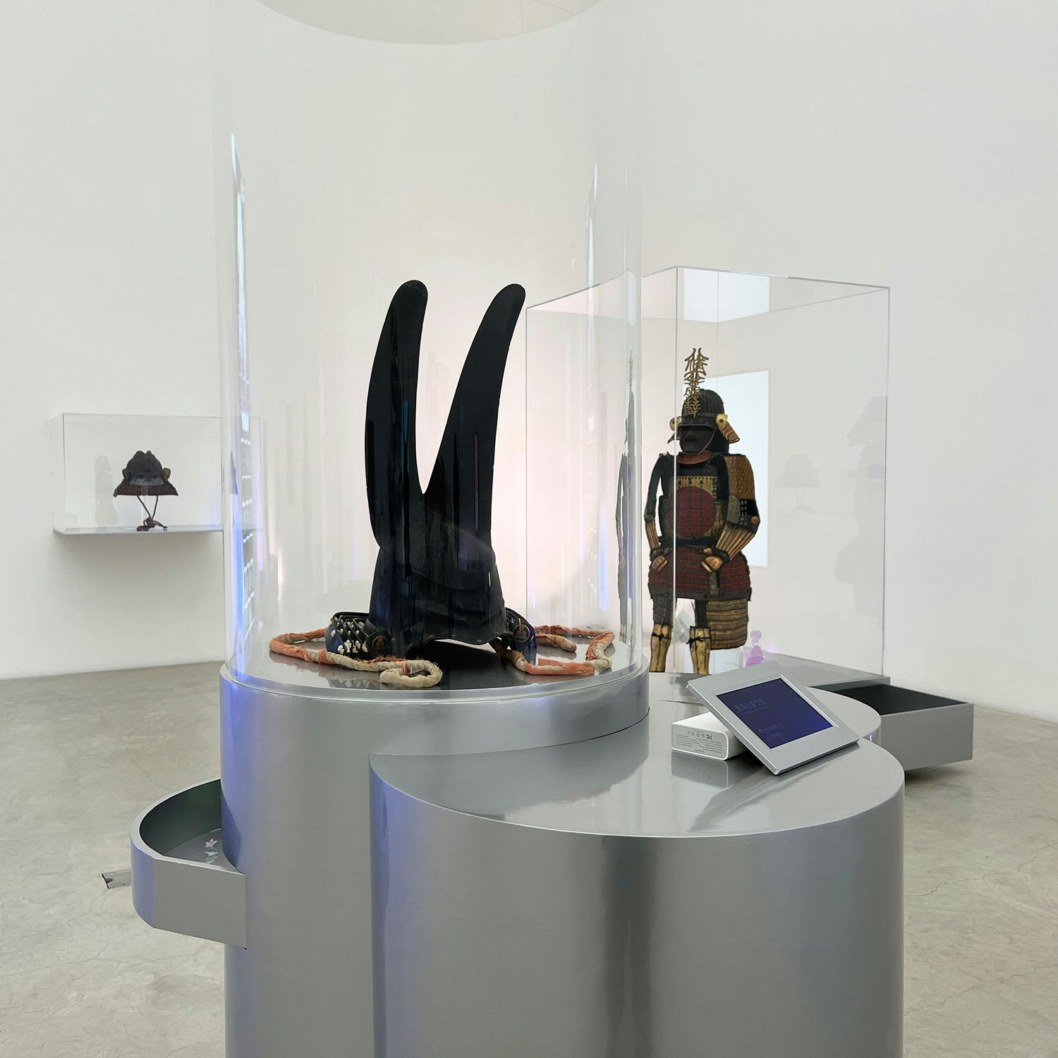 ナイル・ケティングはこの展示空間について、当時の武士が身につけていた教養をセレクトショップやコンセプトストアのようなかたちで昇華したという。ところどころに配されたオブジェクトは、和歌や茶道などの当時の精神世界が表現され、甲冑が現代におけるファッションや戦いのメタファーのように見えてくる。