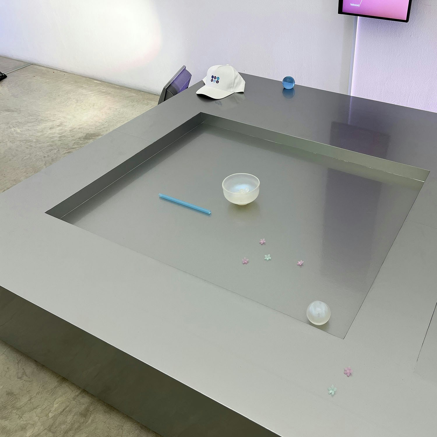 また、床には砂絵を思わせるインスタレーションを設置。本展の会場デザインを手掛けたナイル・ケティングは、それぞれの甲冑にあるシンボルのような紋様を表現するにあたり、日本庭園の様式である枯山水からインスピレーションを得たという。砂の上では小さな球体が絶え間なく動いており、永続的に紋様が描かれていく。