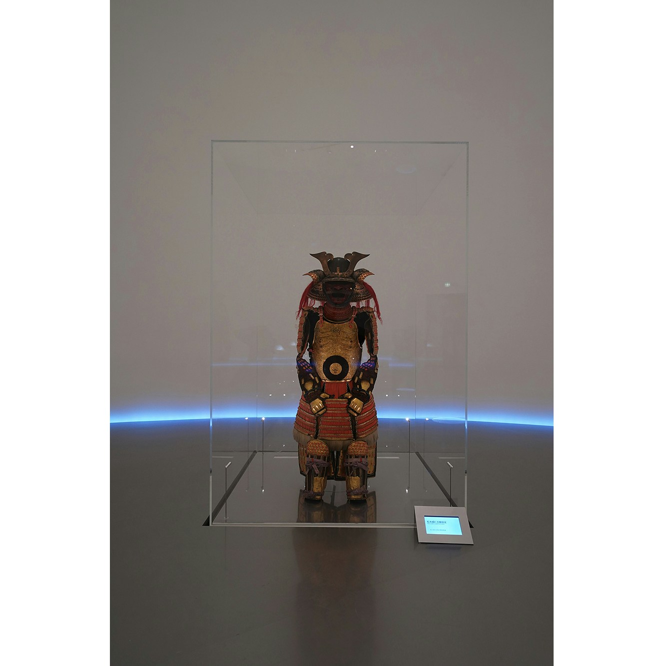 ひとつめの部屋では、石川県立歴史博物館や大阪城天守閣、井伊美術館などから選び抜かれた6領の甲冑を展示。異なった個性を持つ甲冑を360度どこからでも鑑賞できるような展示ケースにくわえ、床から高さのある台座にのせる通常の展示方法ではなく、着座しているほぼ等身大の姿で見せる。これまでの鑑賞方法では見ることができなかった兜や組紐など、そのディテールを存分に楽しめるだろう。