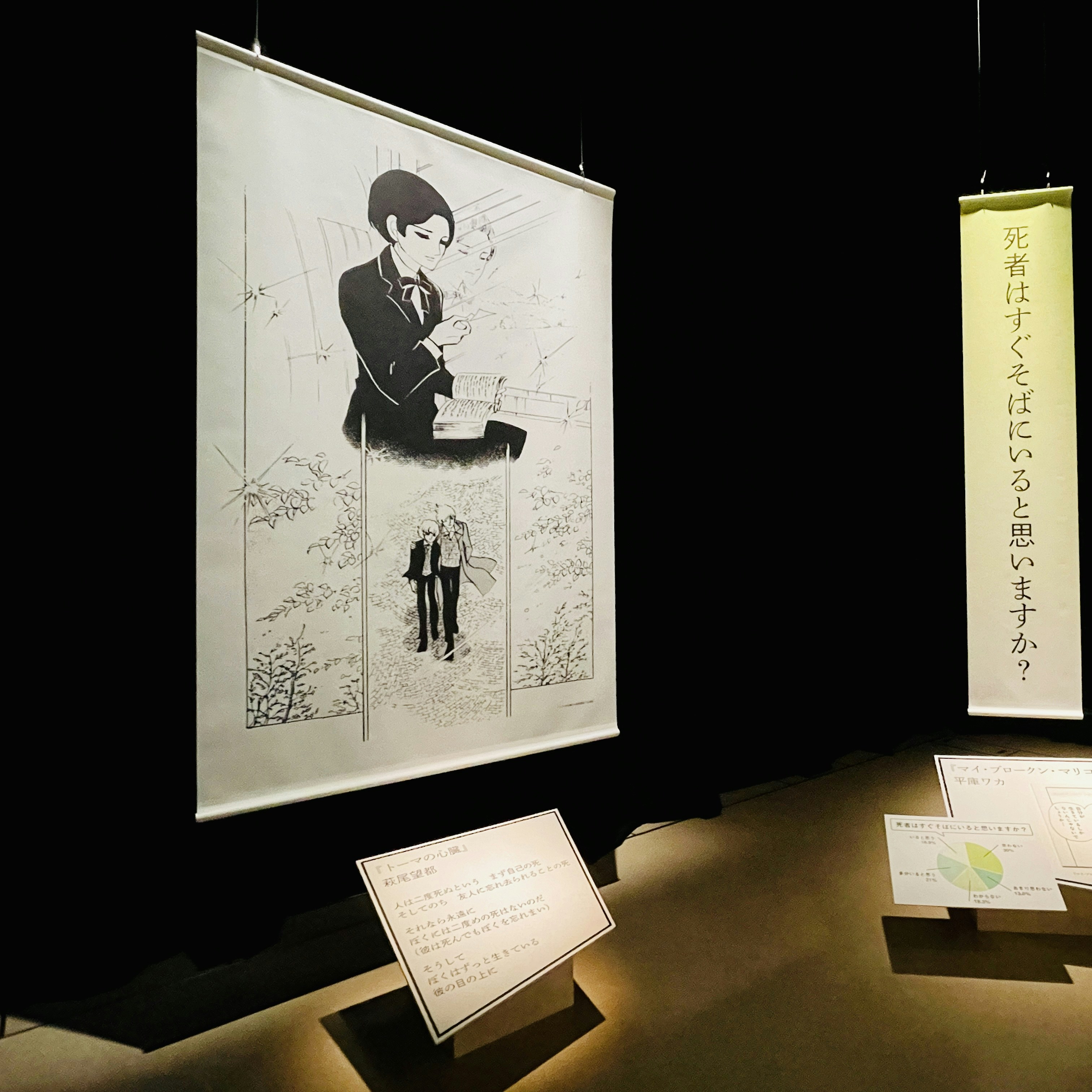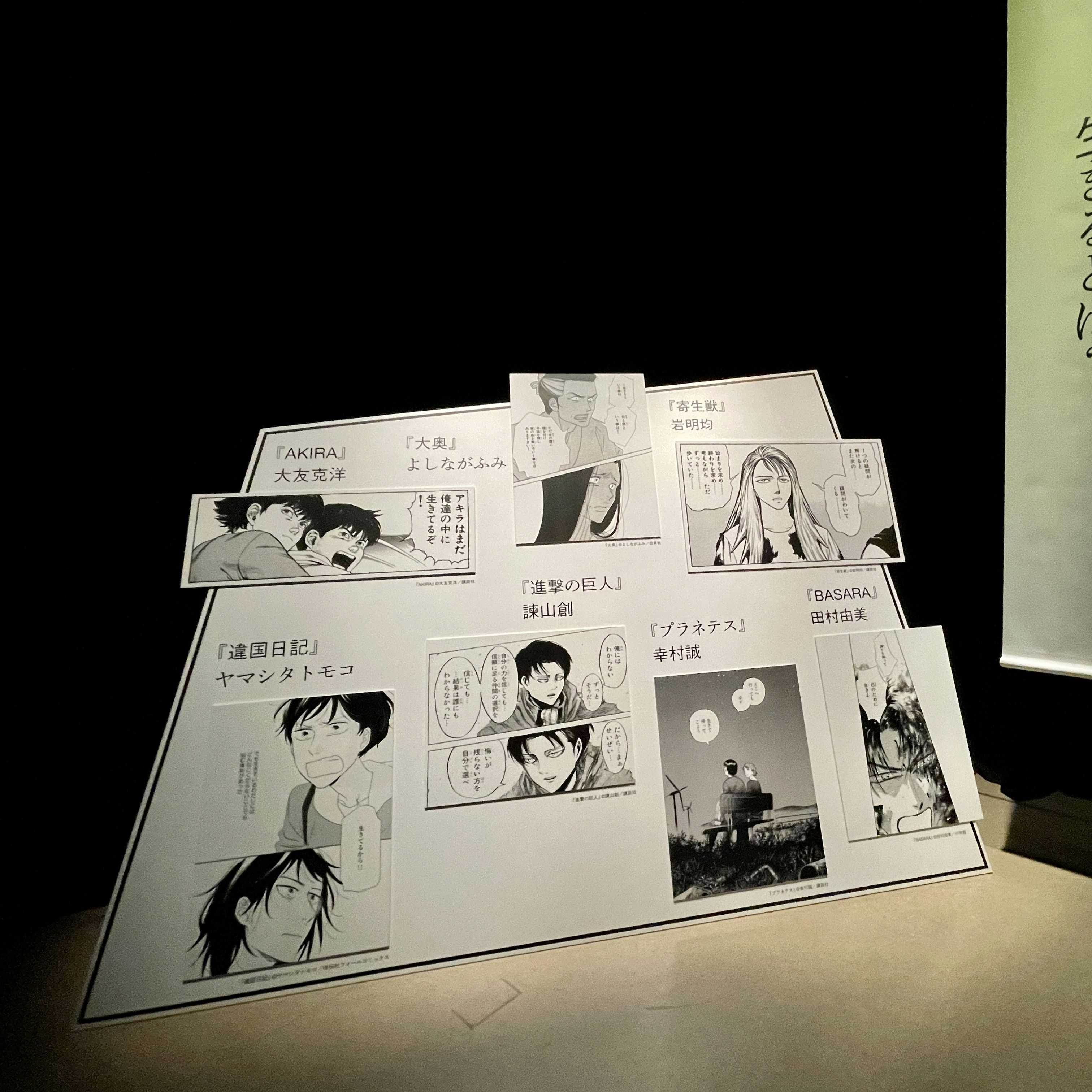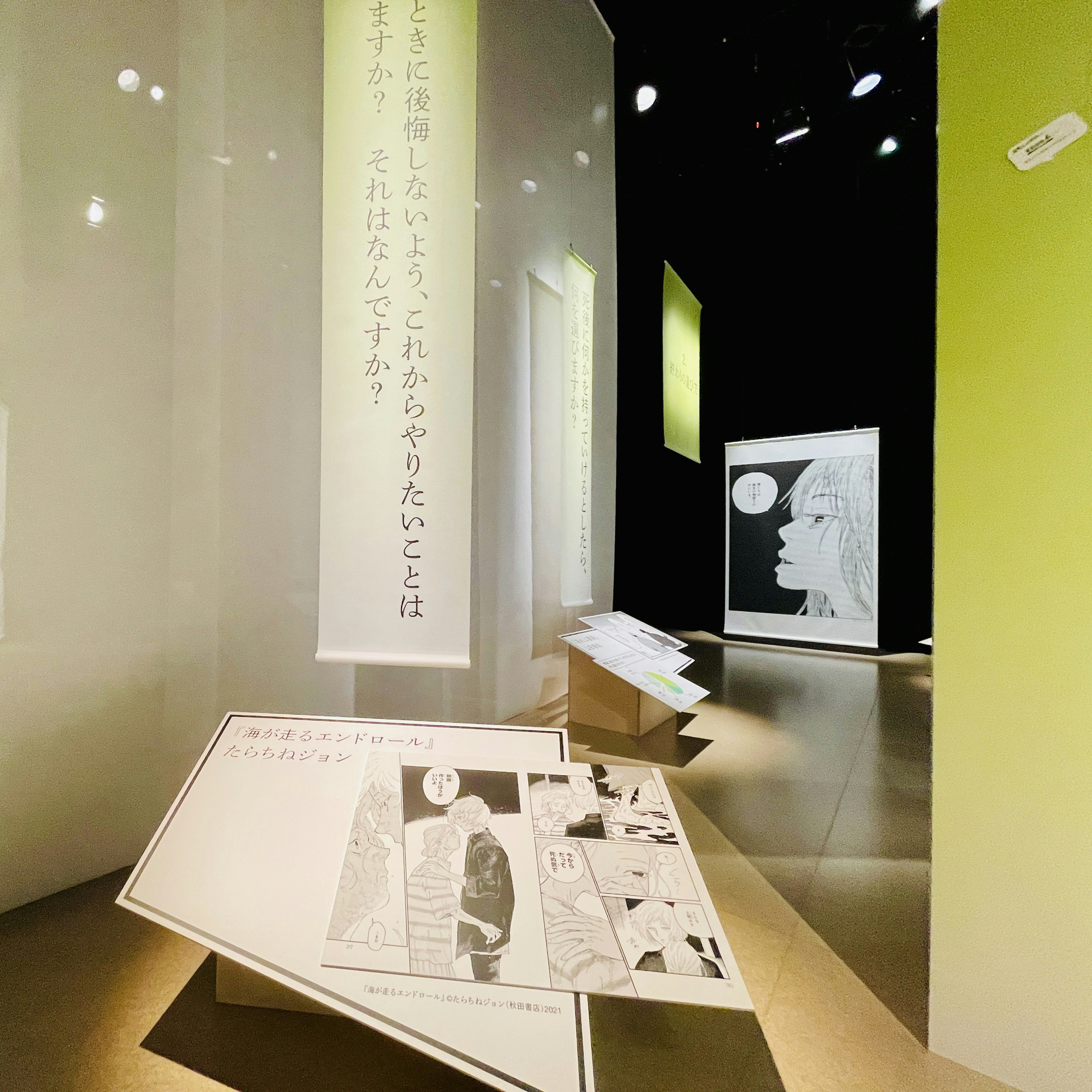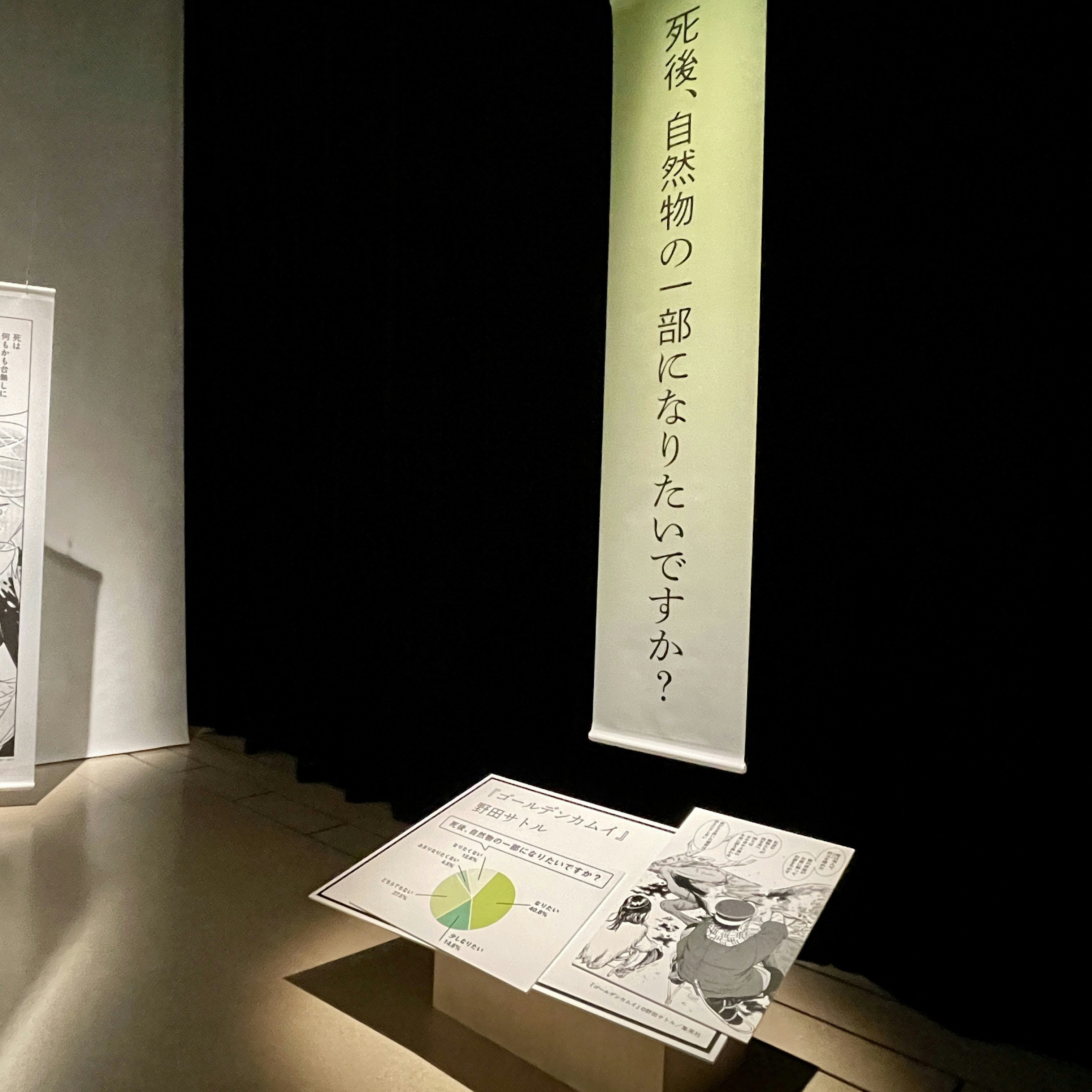 例えば、横山光輝『三国志』と「自分で死にゆく瞬間を決められるとしたらどんな場所で、どんな状況が良いですか?」、野田サトル『ゴールデンカムイ』と「死後、生物の一部になりたいですか?」、たらちねジョン『海が走るエンドロール』と「死ぬときに後悔しないよう、これからやりたいことはありますか? それはなんですか?」などの組み合わせが会場の各所に設置されている。