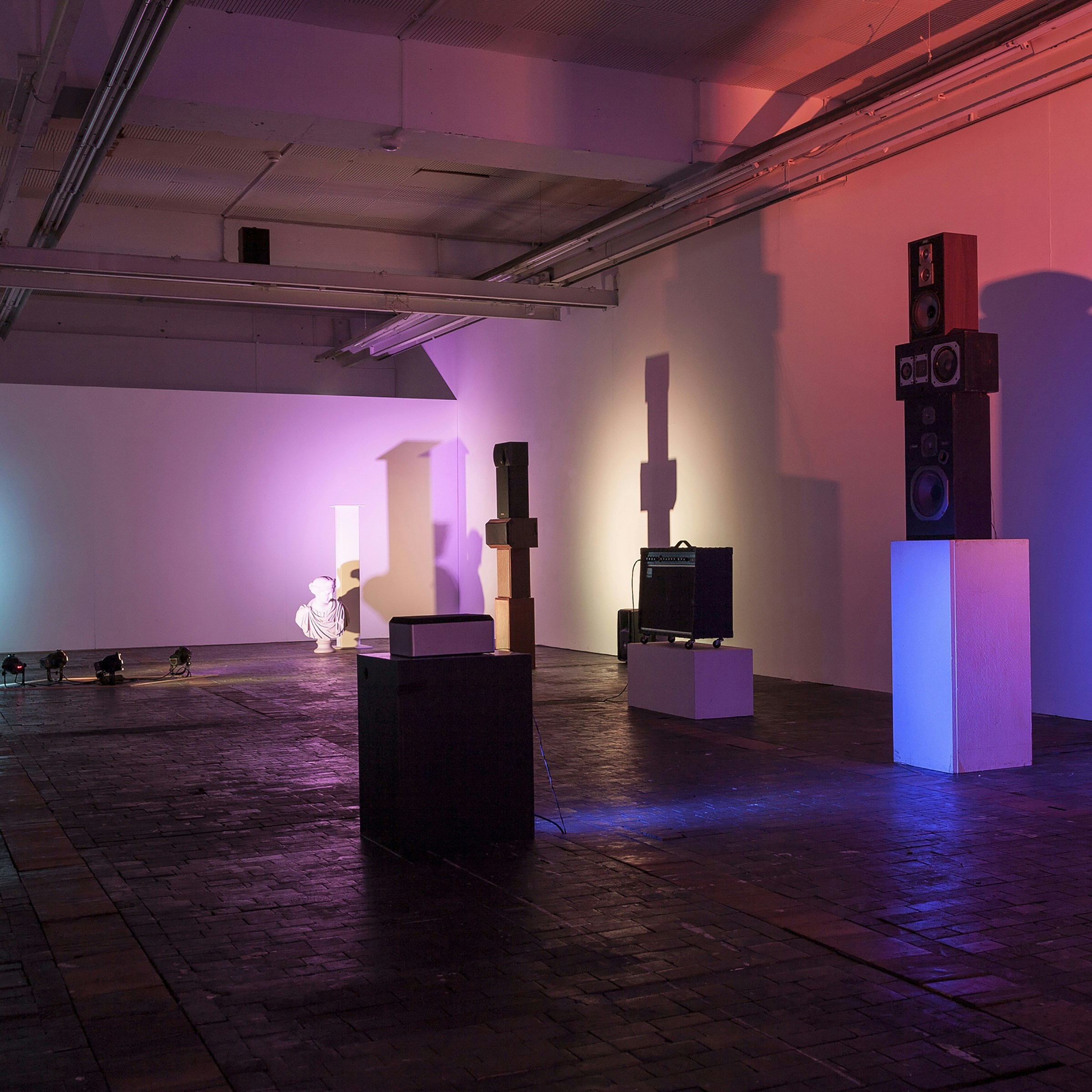 突き当たりにあるオブジェクトとこれを照らす青白い光を眺めると、ふと静寂が訪れる。同じ部屋のなかでも、いつ・どこで立ち止まるかによって、まったく異なる体験ができる。