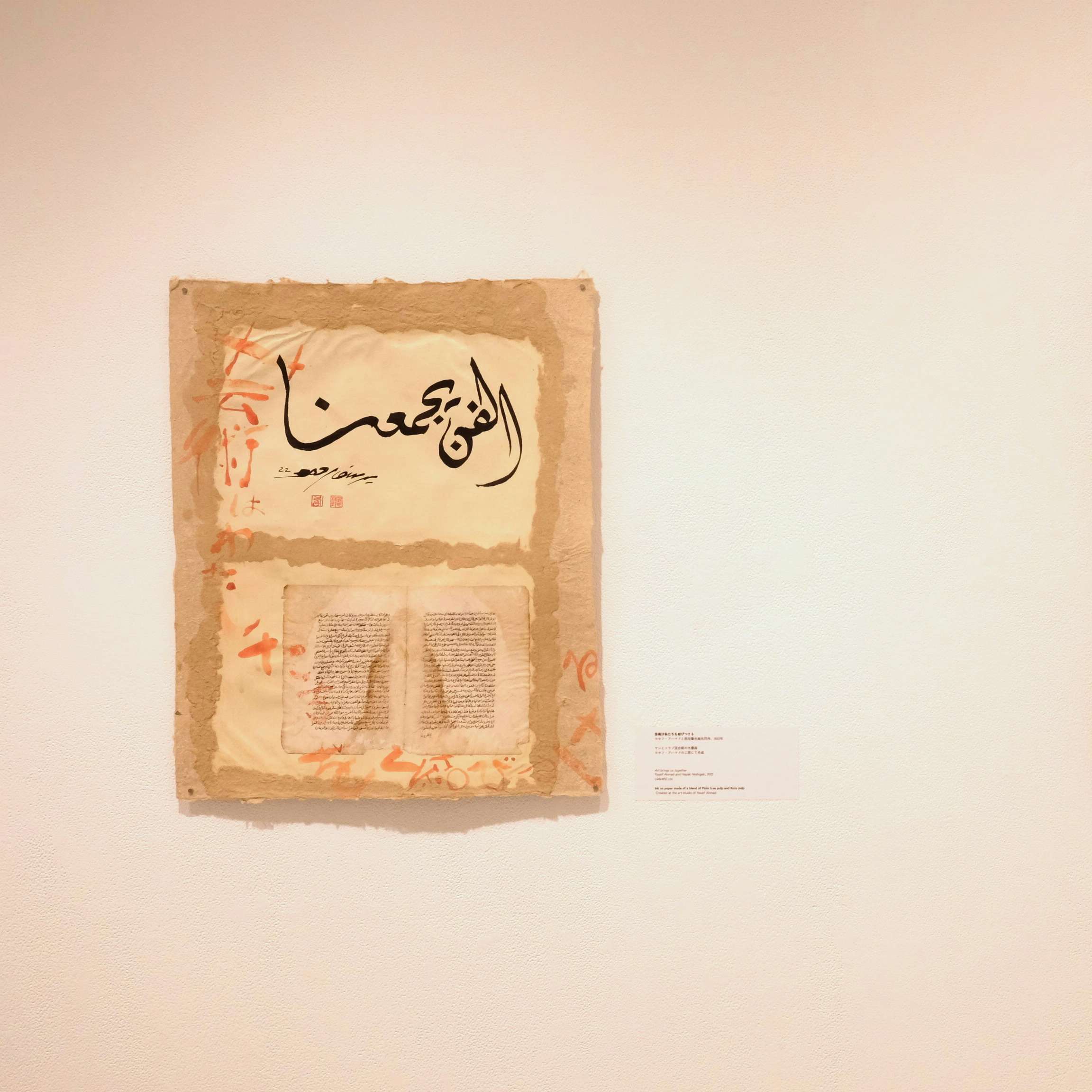 会場ではほかにも、アハマドが日本の国旗をモチーフに描いた作品や、西垣がふたりの共同作業の様子やドーハの街中の情景を水墨画で描いた作品、アラビア文字と日本文字の連結を試みた作品など、ふたりの紙と文字の思索が垣間見える作品が並ぶ。