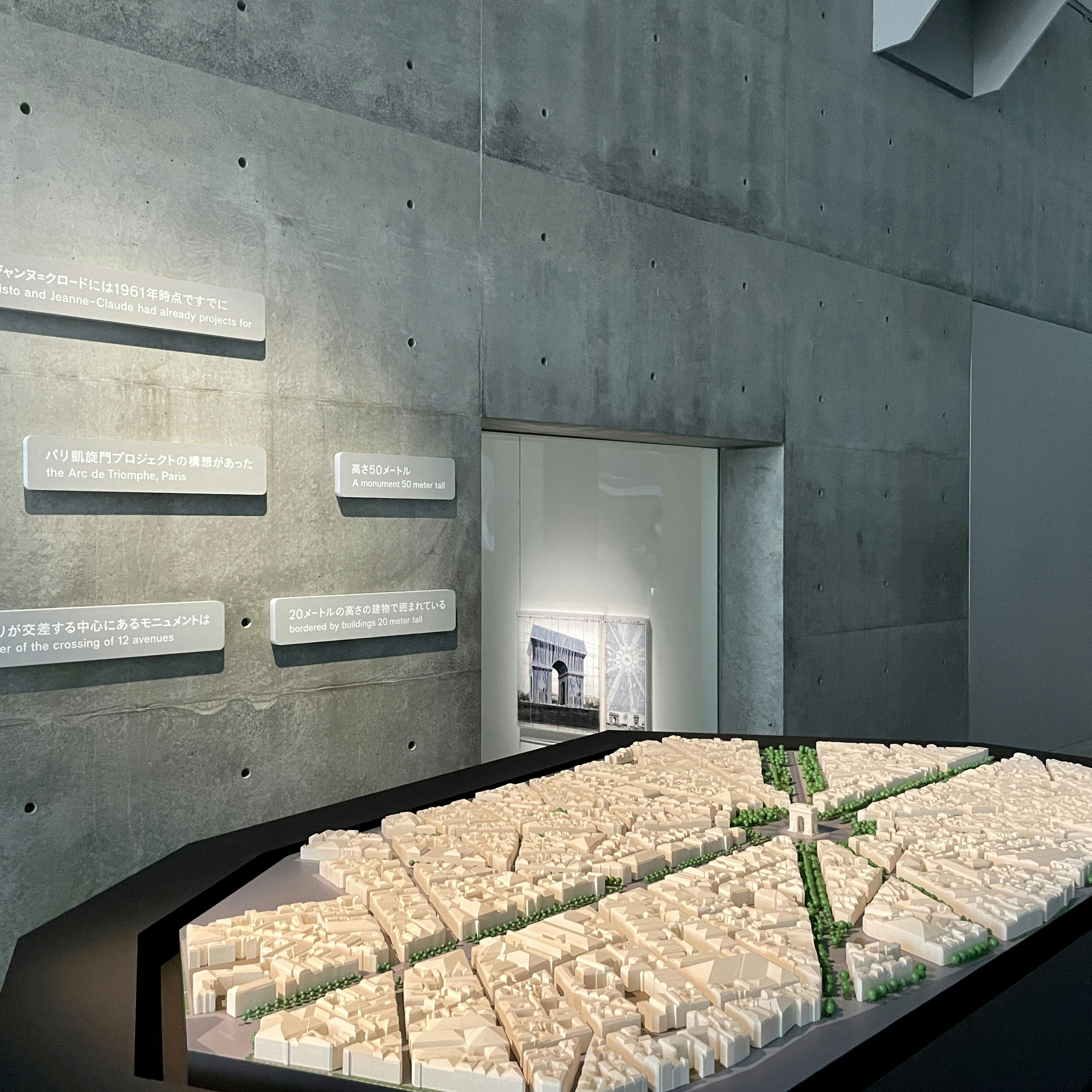 地下ロビーでは、クリストとジャンヌ=クロードの過去の大規模プロジェクトを紹介する動画や、凱旋門周辺のパリ市街の模型、ニューヨークのスタジオで様々なプロジェクトを描くクリストの様子を紹介する写真パネルが展示されている。