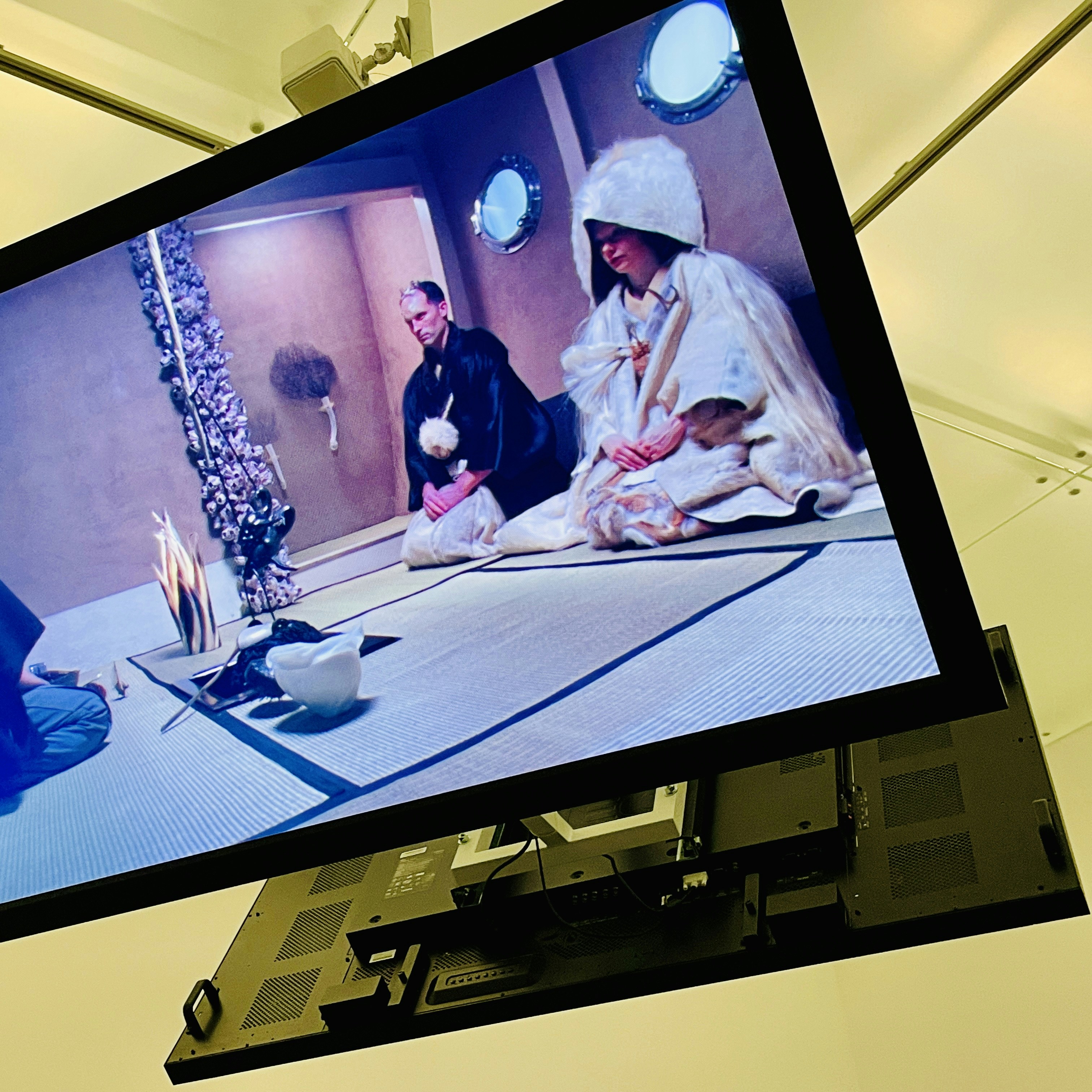 《拘束のドローイング9》のテーマとなっているのは、捕鯨や茶道といった日本文化。その主題をもとに、映画、彫刻インスタレーション、写真など多彩なメディアで構成されている。本展では、映画《拘束のドローイング9》のモニター上映のほか、映画に登場する重要なキャラクターであり場所でもある捕鯨船「日新丸」の立体作品や写真作品、そして同館コレクションの《拘束のドローイング8:誕生の裂片》もあわせて展示。バーニーの、日本文化に対するヴィジュアル的な解釈を多角的に見て取ることができる。