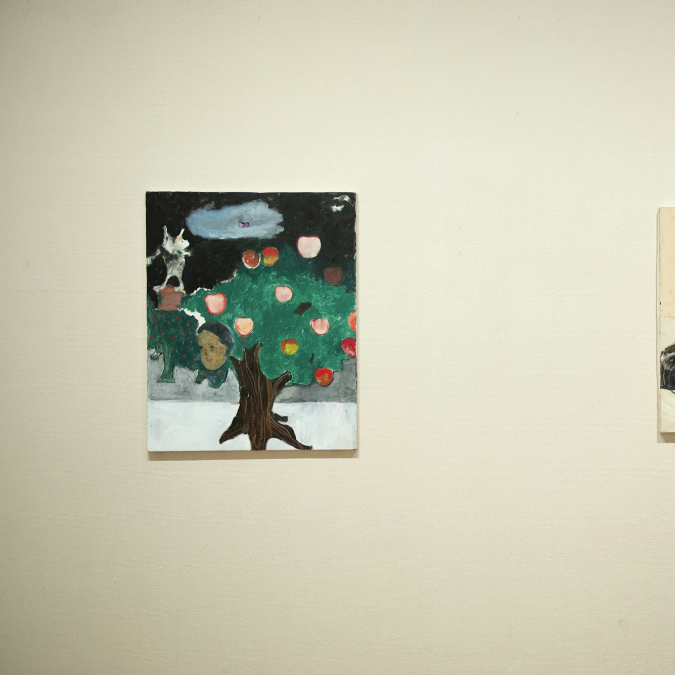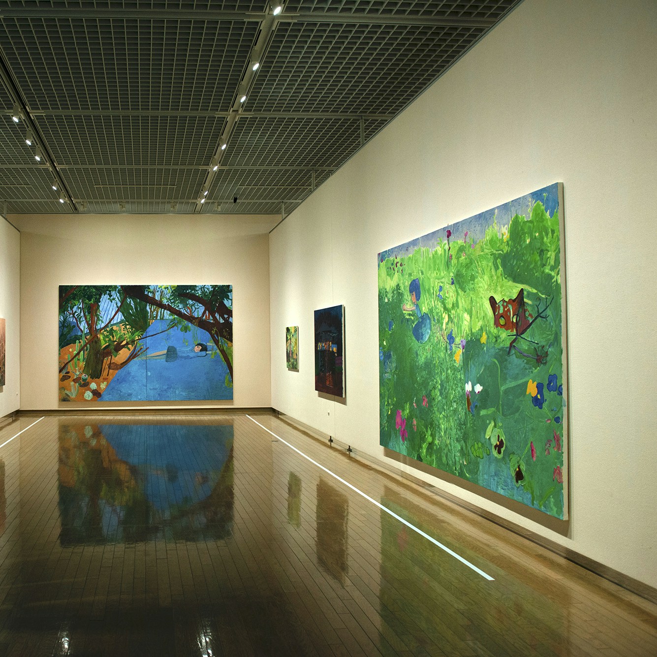 展示風景より、左から「GEISAI」で小山登美夫賞を受賞した《よなような》(2001)、学部の授業で描いた《Untitled》(1999)
