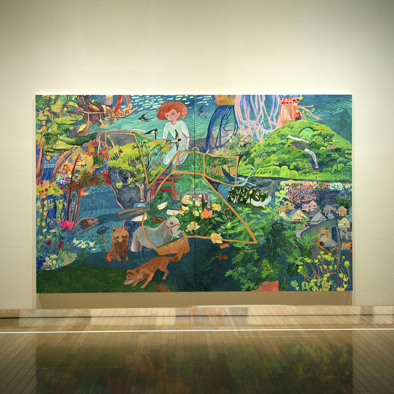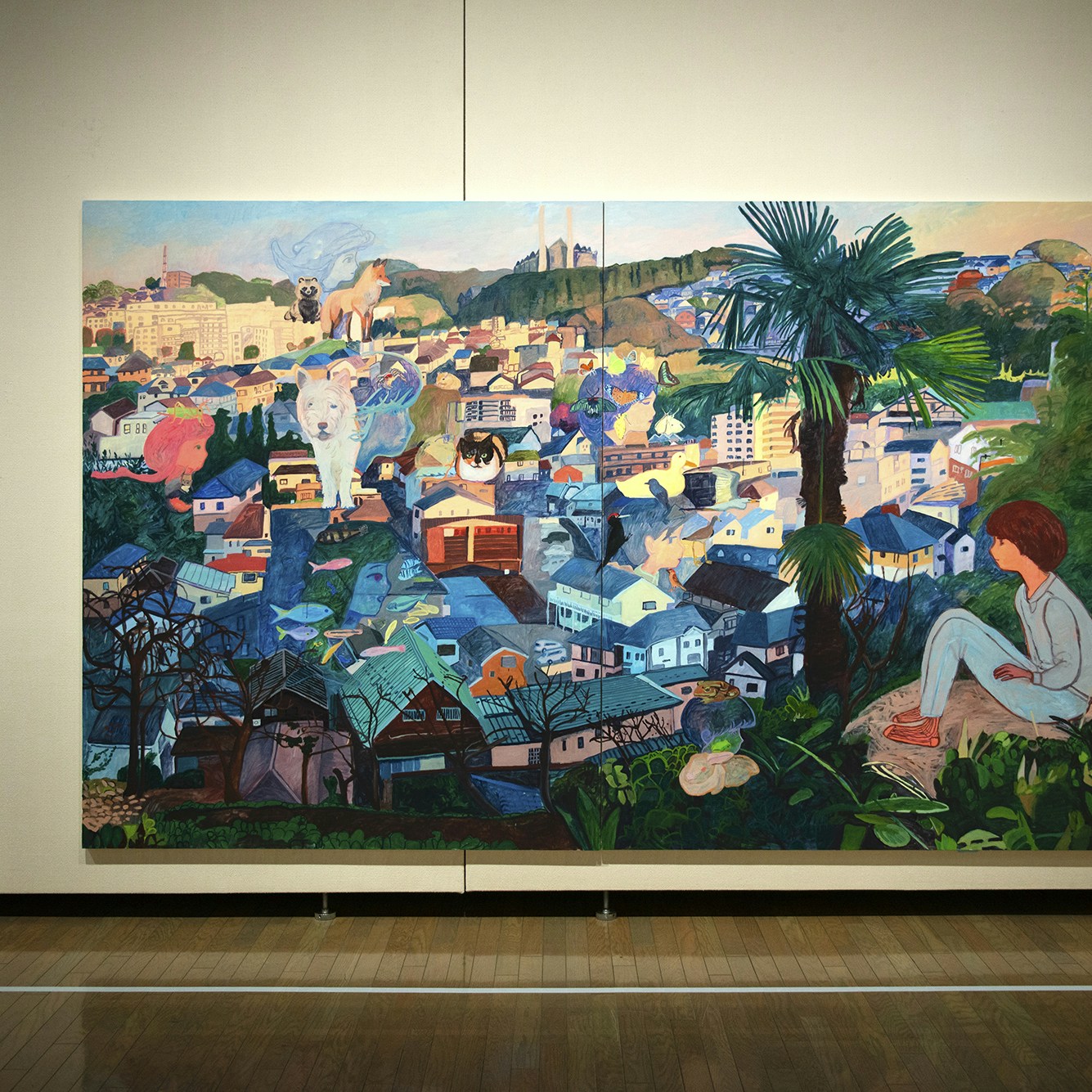 日常生活で出会った風景を組み合わせ、ダイナミックな画面構成で描く工藤麻紀子。学生時代の作品から最新作まで、インスタレーションも含めて140点余りの作品を集めた「工藤麻紀子 花が咲いて存在に気が付くみたいな」と題する個展が、平塚美術館で始まった。