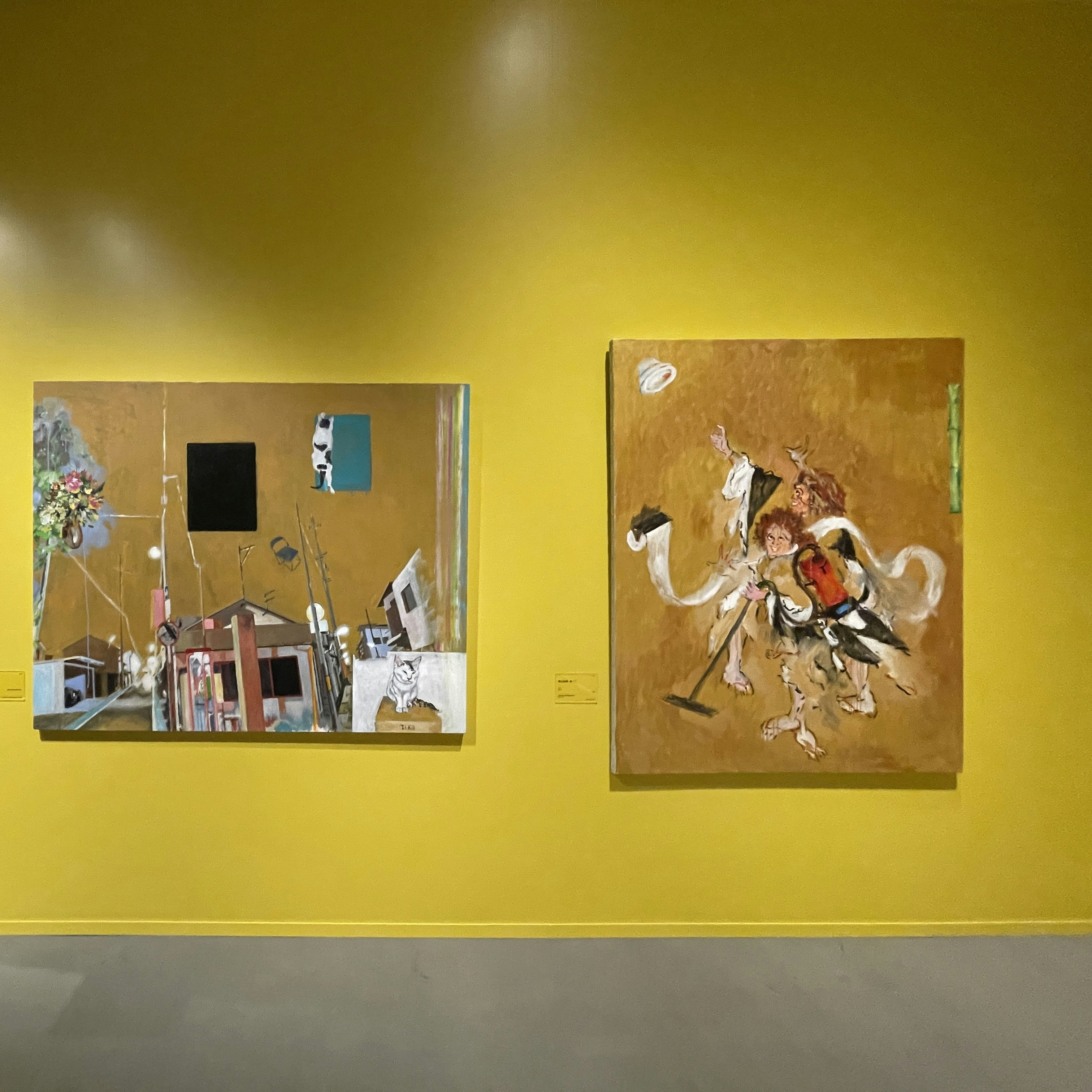 こうした黒のY字路を抜けると、カラフルなY字路をはじめとする作品群が現れる。横尾は「暗く人通りのない夜のY字路」という自ら定めたY字路のルールを破り、キャンバスは色彩豊かなパレットと化している。このセクションでは、横尾の高校生時代の作品である《飾磨港風景》(1954-55)や、2021年に描かれた新作《二刀流再び》など、色彩あふれる作品にも注目だ。