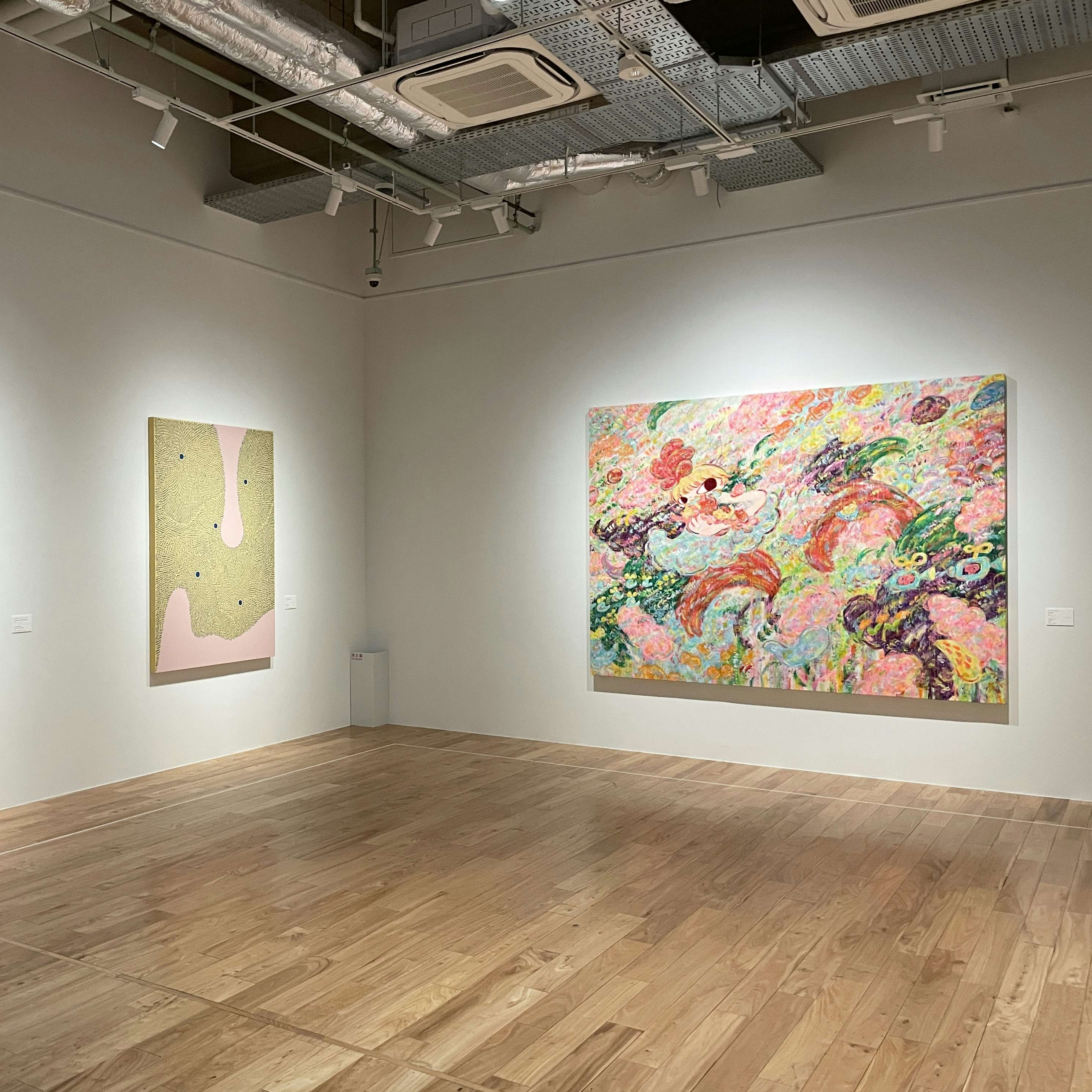 隣のSPACE 4では、鮮やかな色彩や生命力にあふれた作品を制作している近藤亜樹の絵画作品群を展示。「家族」をテーマにした幸福で満ち溢れる《HOUSE》(2017)や、2021年に初の作品集『ここにあるしあわせ』の刊行にあわせて都内の4ヶ所で展覧会が開催された際に生まれた大型の作品《星、光る》(2021)などが、逞しく生きる力を見せている。