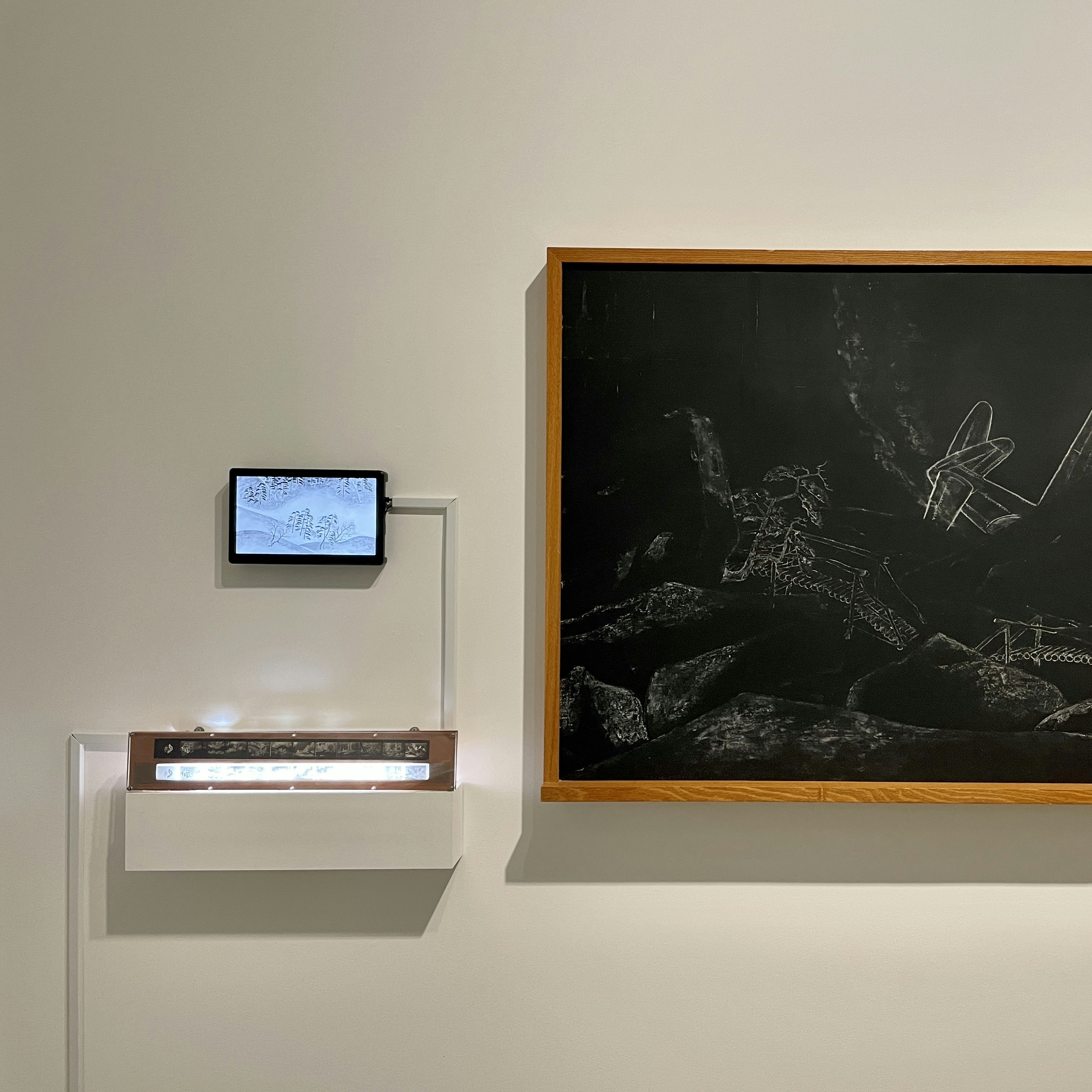 隣に展示された匿名の芸術家集団・国民投票(1992〜)の《起承転結》(1997)は、黒板にチョークでアニメーションを描き、スチールで撮ったのちに最後の1枚の絵のみを残したという作品。近代日本画の巨匠・横山大観の作品を想起させる画面には、ディズニー映画『バンビ』に登場するスカンク「フラワー」が毒ガスを発し、そこに生きていた動植物が倒れ、枯れ果てた山水のなかにゼロ戦が突っ込んできて爆発するシーンが描かれていたという。戦争に加担していたエンターテインメント産業や日本画など芸術の政治性や戦争責任を批判している。