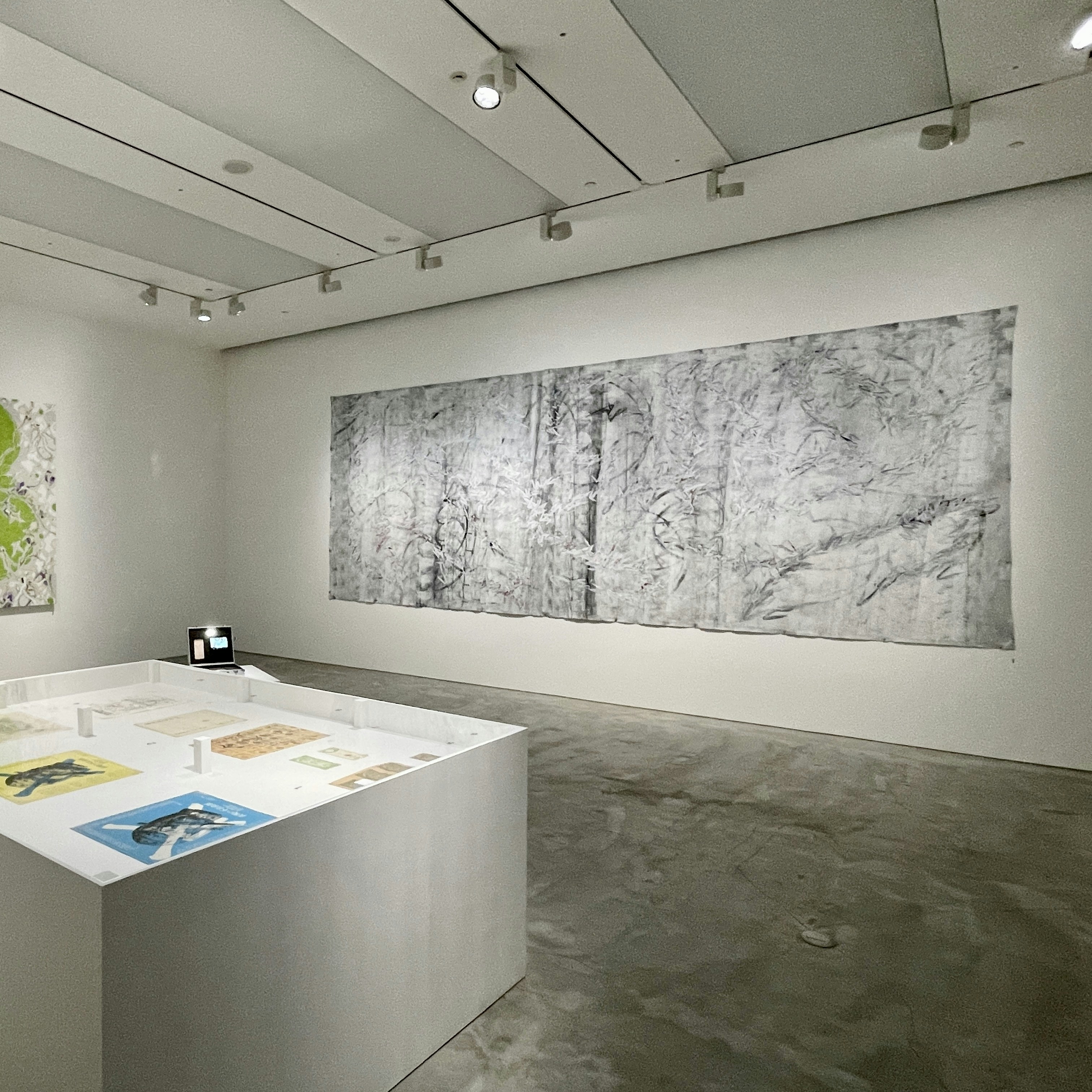 第2展示室では、中西夏之(1935〜2016)、大山エンリコイサム(1983〜)、MIKA TAMORI(1984〜)の絵画作品が3面の壁に飾られている。紫や白、黄緑を基調とした中西の抽象絵画《R・R・W─4ツの始まり -Ⅰ》(2001)を、方法論や時代も異なる大山とTAMORIの抽象画作品とともに見るのは面白いだろう。