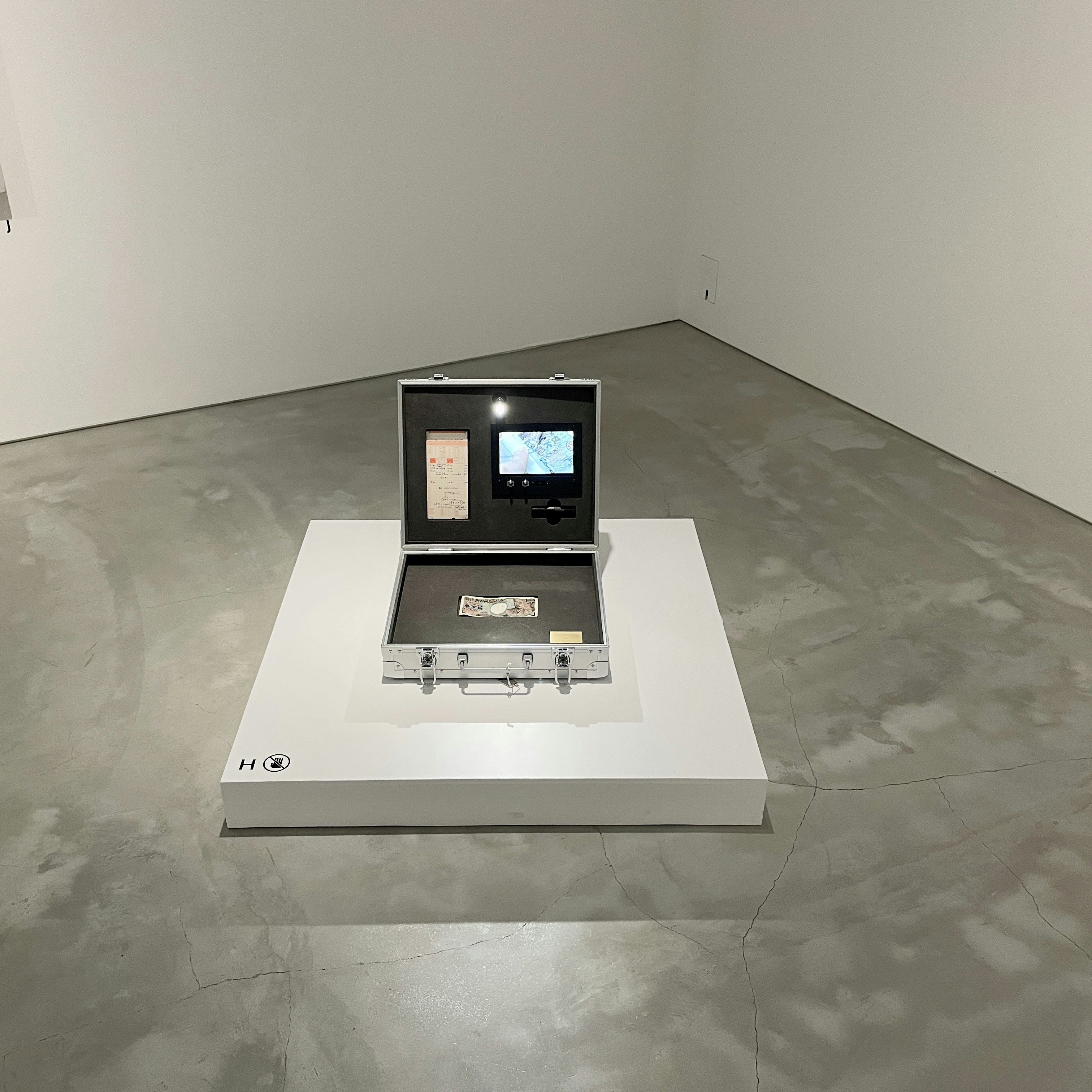「模型千円札」シリーズの隣には赤瀬川の《大日本零円札》(1967)が展示。同作と対比して紹介されているのは、青山悟(1973〜)が刺繍を使って制作した一万円札の作品《Just a piece of fabric》(2022)だ。労働時間とその価値の関係性について作品を介して取り組んでいる青山は、1968年に発生した「三億円強奪事件」と同種類のジュラルミンケースを使った作品も発表。そのケースに設置されたモニターでは、作品制作の過程をとらえた映像が流れている。