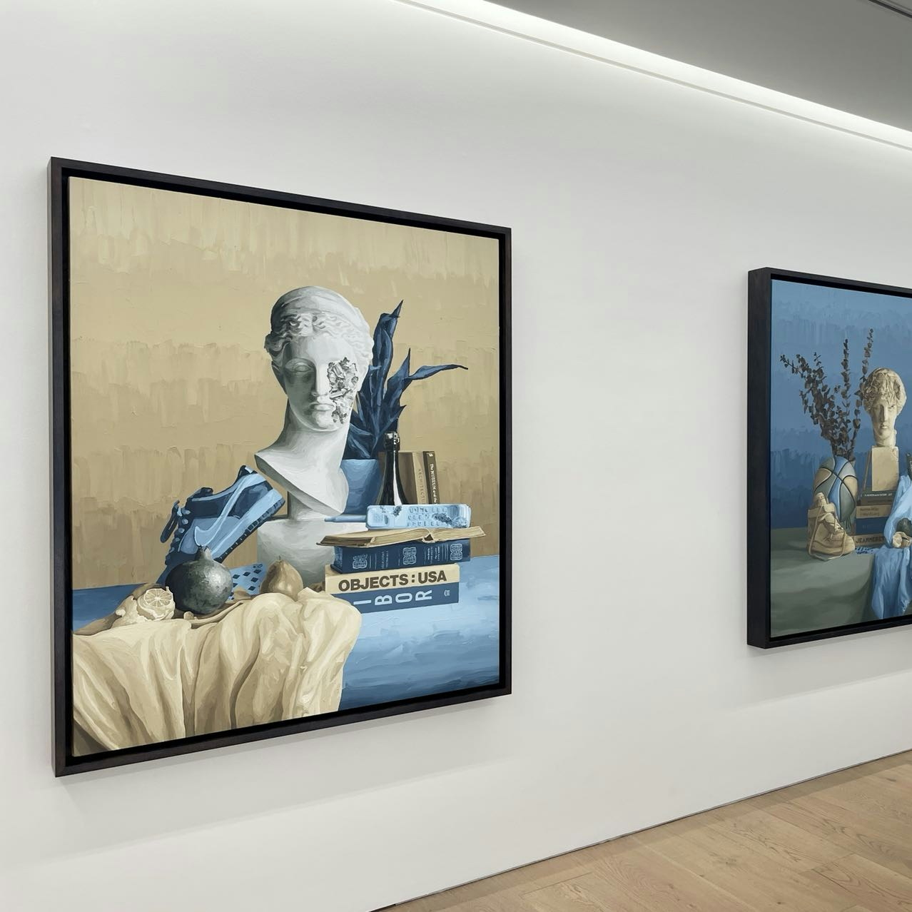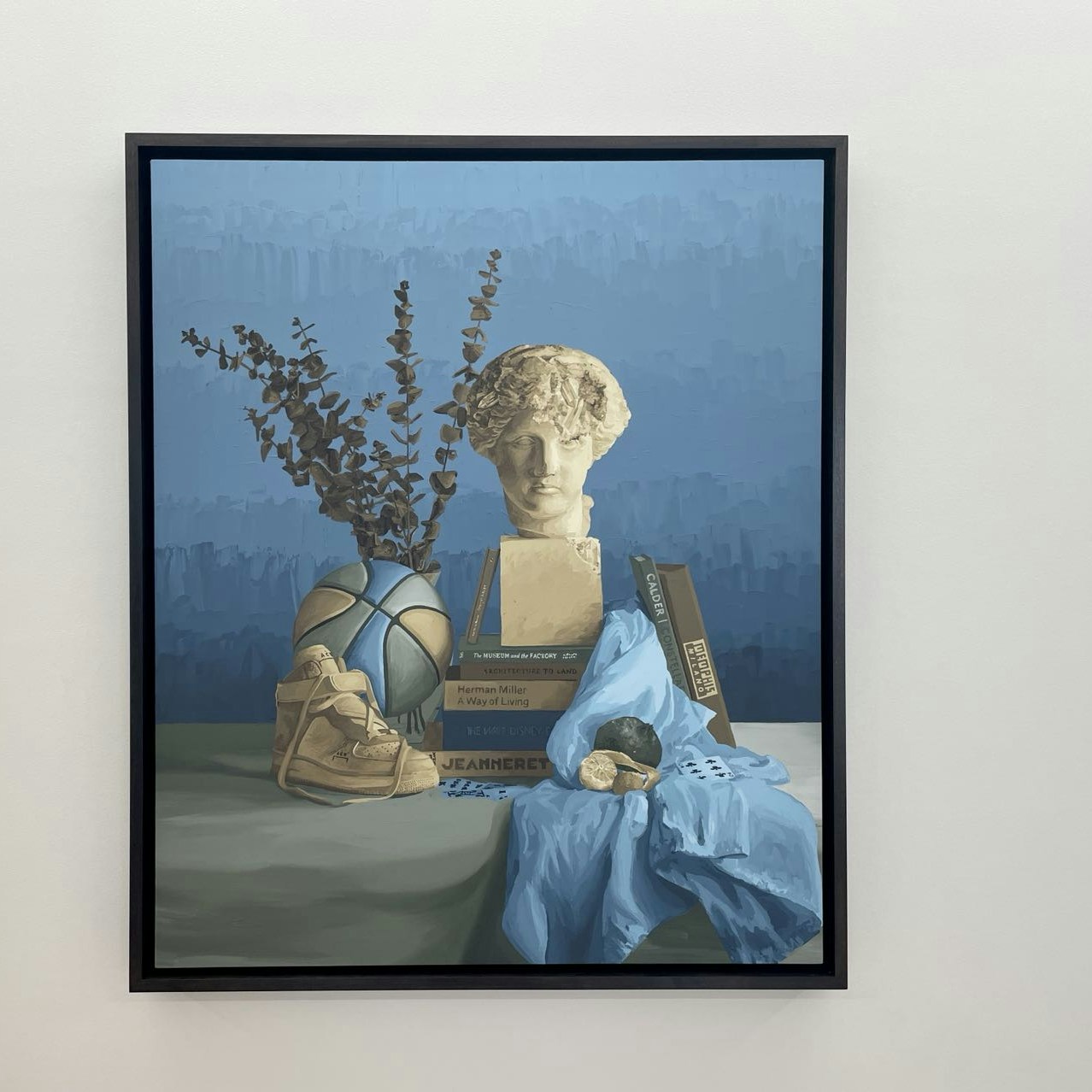 しかし、本展で発表された新作の静物画5点は、ニューヨークの絵具メーカーがアーシャムのために開発した厚みのテクスチャーのある絵具を用いて、厚塗りの技法を駆使して制作されたもの。オランダ黄金時代の静物画を思わせる画面には、アーシャム自身がつくったギリシャの神の彫刻をはじめ、スタジオにある本、スニーカー、バスケットボールなど身近なモチーフが描かれている。それぞれのモチーフは作家自身との個人的な関係性を重層的に物語っており、「現代文化や歴史について考えさせる」ものでもある。