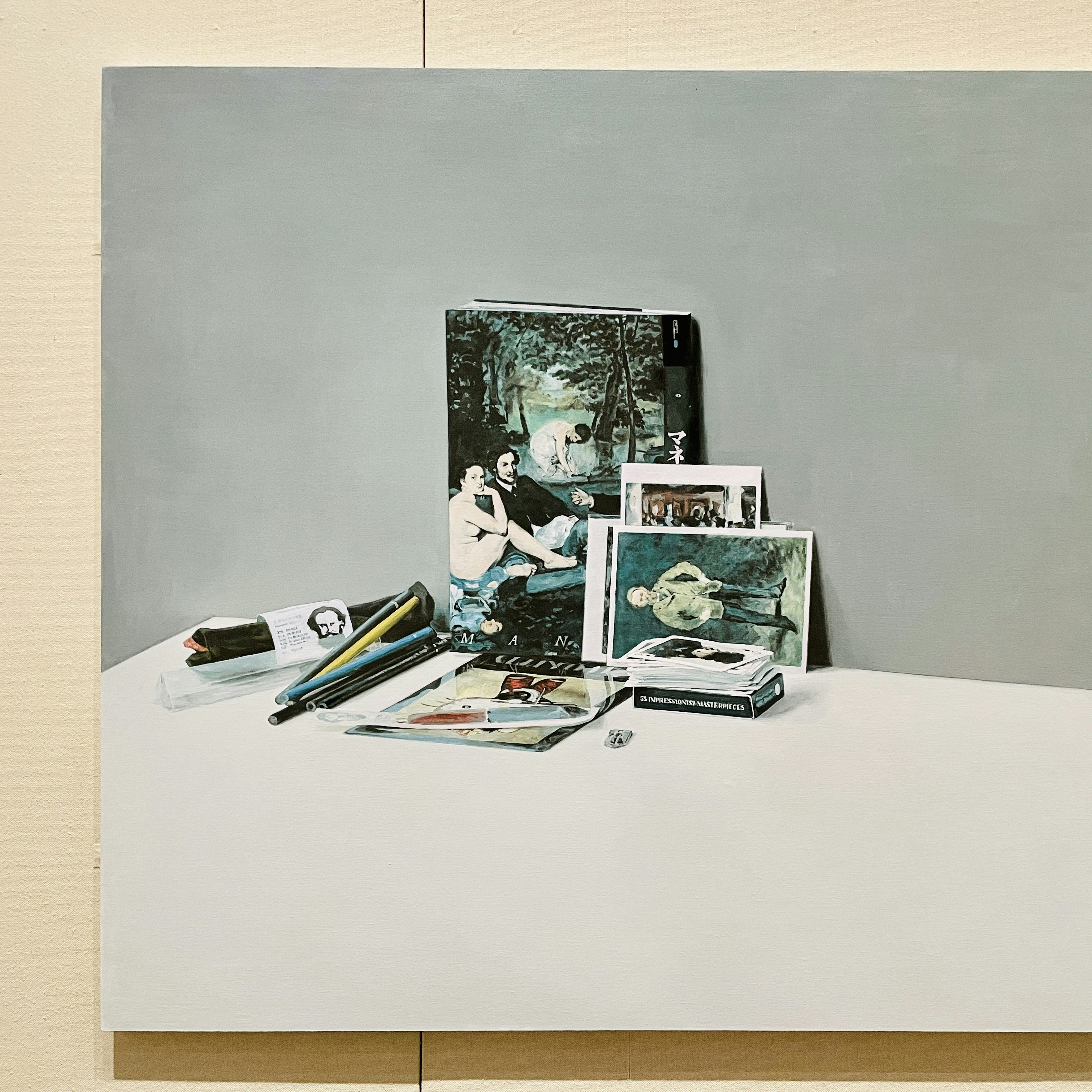 《ミュージアムショップのマネ》(2022)は、福田が都内のミュージアムショップを巡った際にマネのグッズが極端に少ないことに気付いたことから着想されたもの。マネの静物画の灰色のなかに、数少ないグッズが静かに並ぶ。