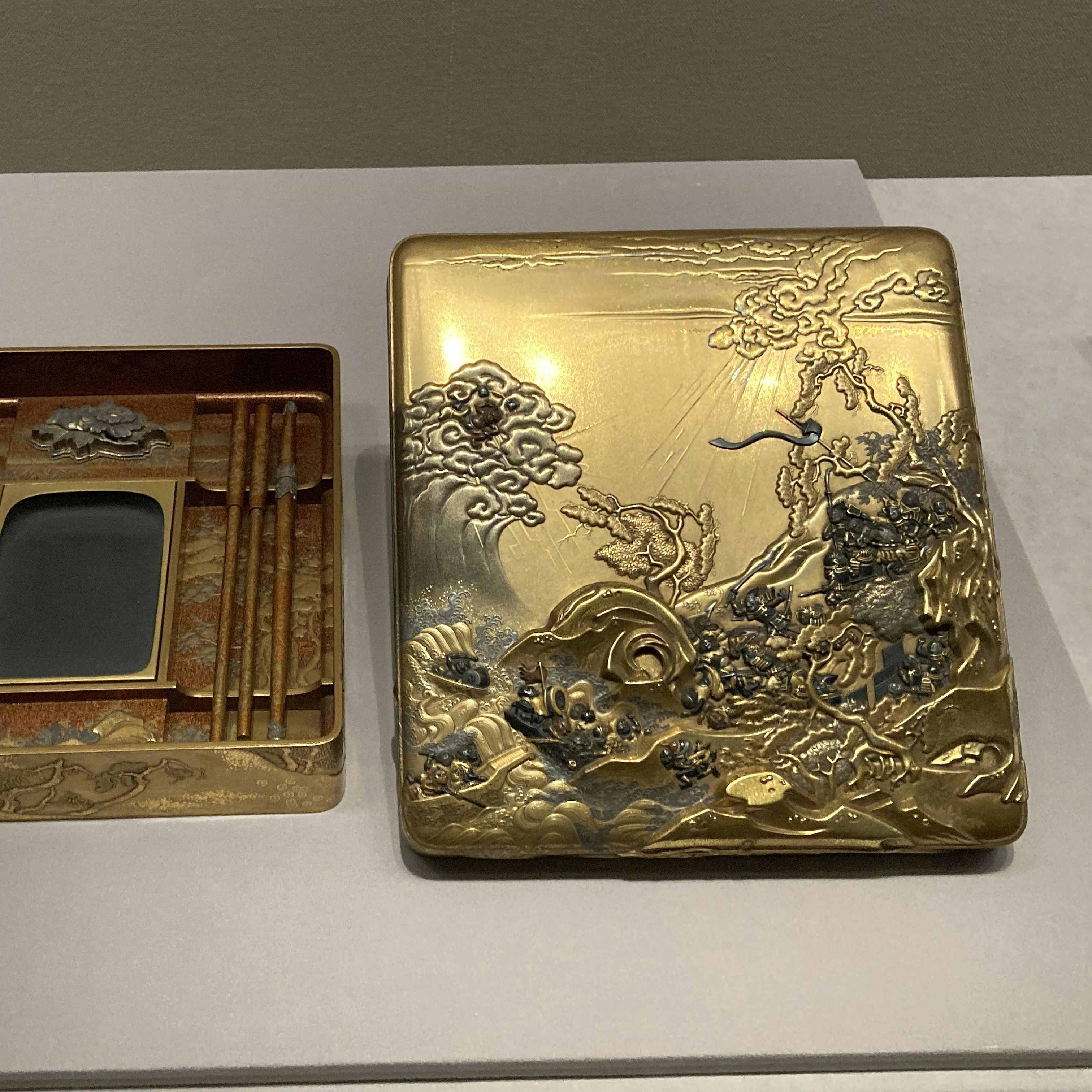 室町のころの作品に、それらが収まっていた箱を想像しつつ、やがて江戸から明治にかけて単独でも制作されていく過程を、その超絶技巧とともに追ってみたい。