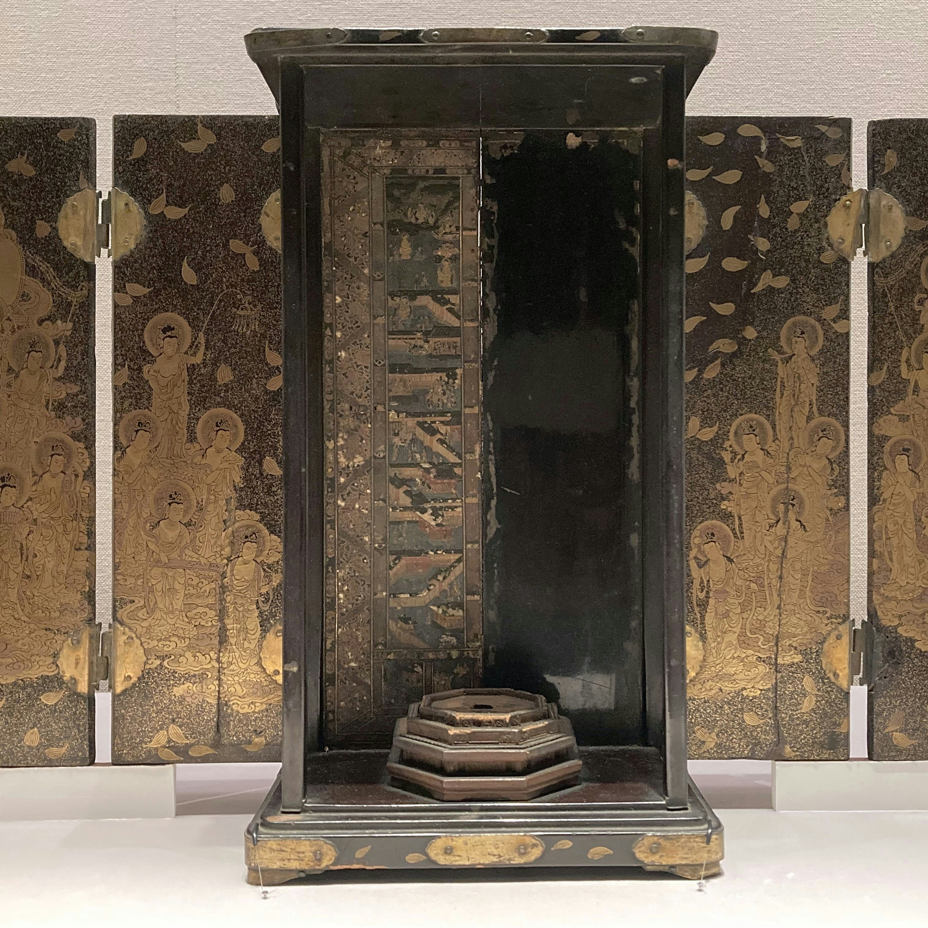 仏具からは、《二十五菩薩来迎蒔絵厨子》を。室町時代の作で、浄土信仰の来迎図が厨子の内扉に精緻な蒔絵で表されている。現在は台座のみが遺されるが、本来は阿弥陀如来像が安置されていたのだろう。描かれた菩薩の唇には朱もさされており、信仰の想いのこもった細やかな表現はぜひ会場で確認してほしい。