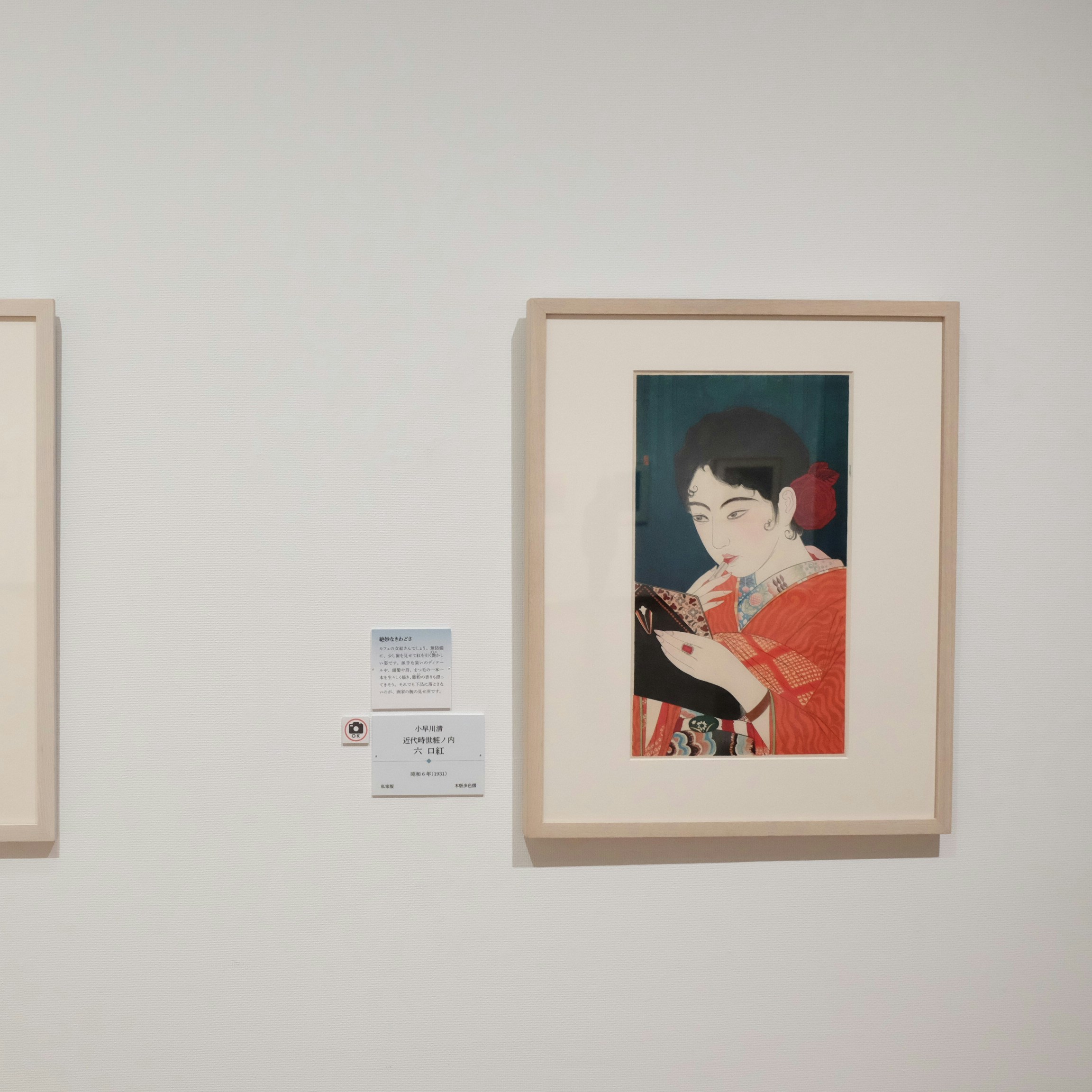 展示風景より、左から小早川清《近代時世粧ノ内 一 ほろ酔ひ》(1930)、《近代時世粧ノ内 六 口紅》(1931)