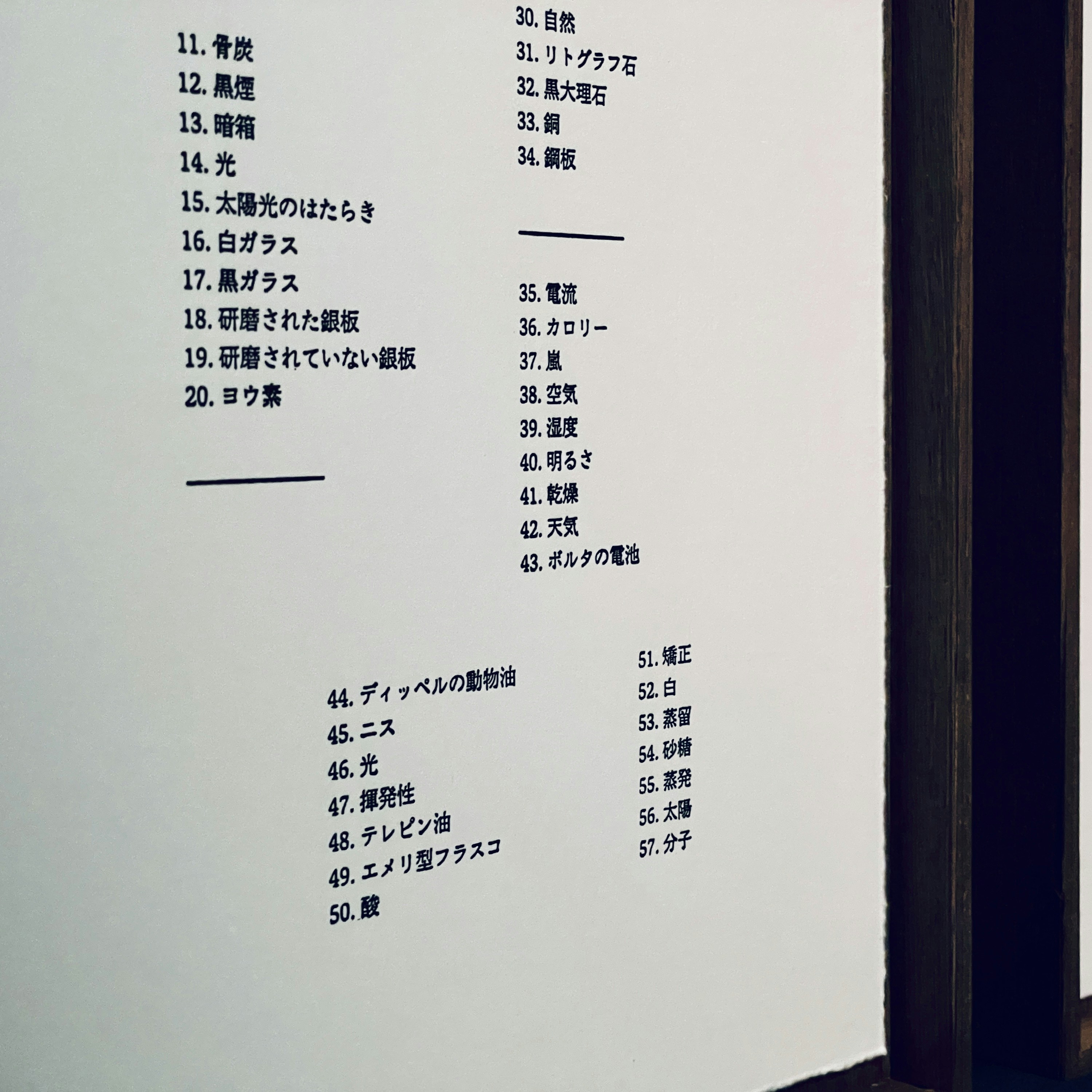 そして何より興味深いのは、ニエプスの失敗例の作品化だ。例えば《無題(向かい合う石版石)》は内側が平らに研磨された石版石を擦り合わせることで写真を生み出そうとしたもの。《無題(材料一覧)》は、写真を発明するための素材のリストだが、そのなかには「カロリー」「嵐」といったものまで並んでいる。