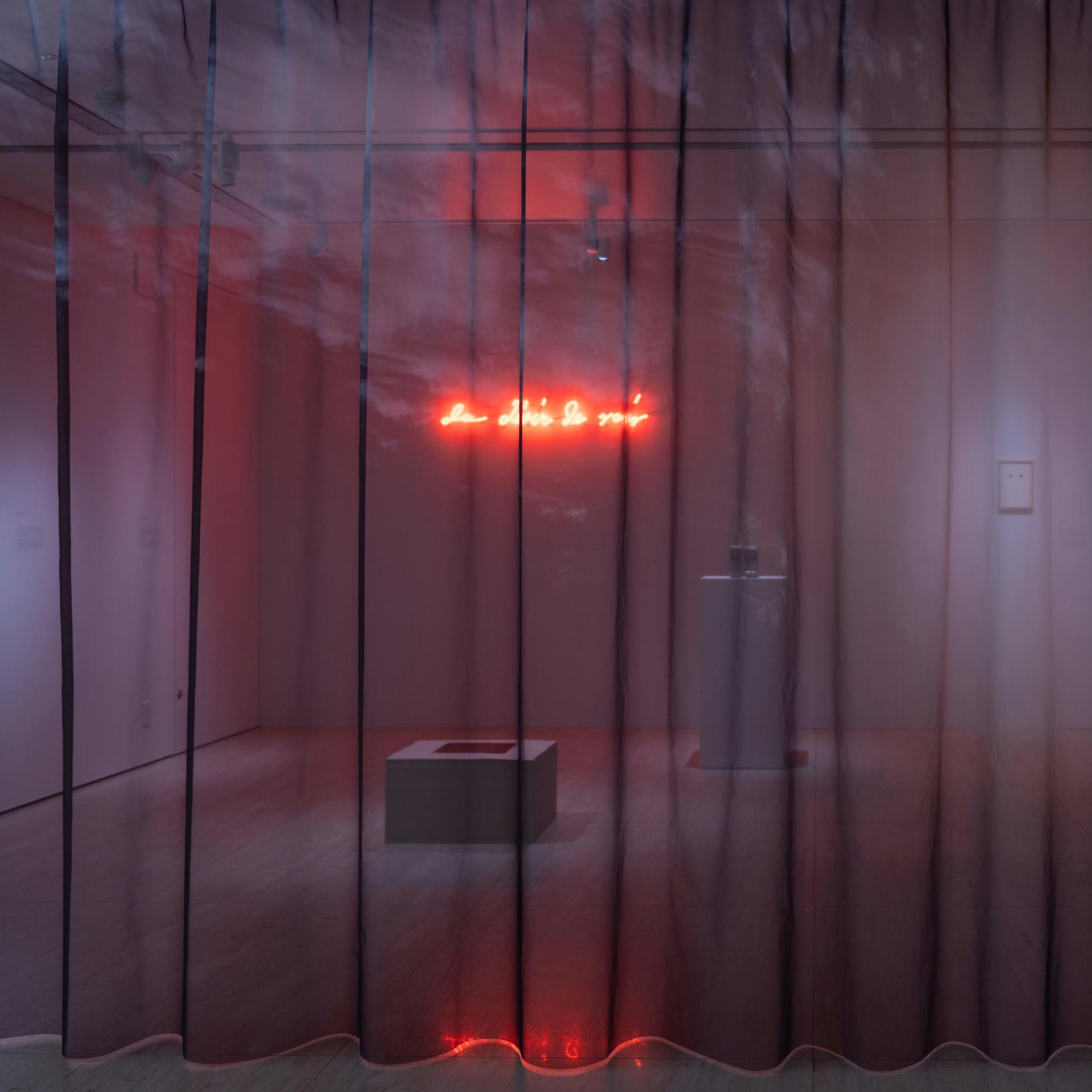 これを抜けると、展示室では真っ赤なネオンが存在感を放つ。《無題(見たいという欲望)》は、写真の発明のきっかけとなったダゲールの手紙の一節「あなたの、自然に基づいた習作を見たいという欲望に私は燃えている」から取られたもの。ダゲールの筆跡のままネオンにすることで、写真に対する欲望の強さが表現されている。
