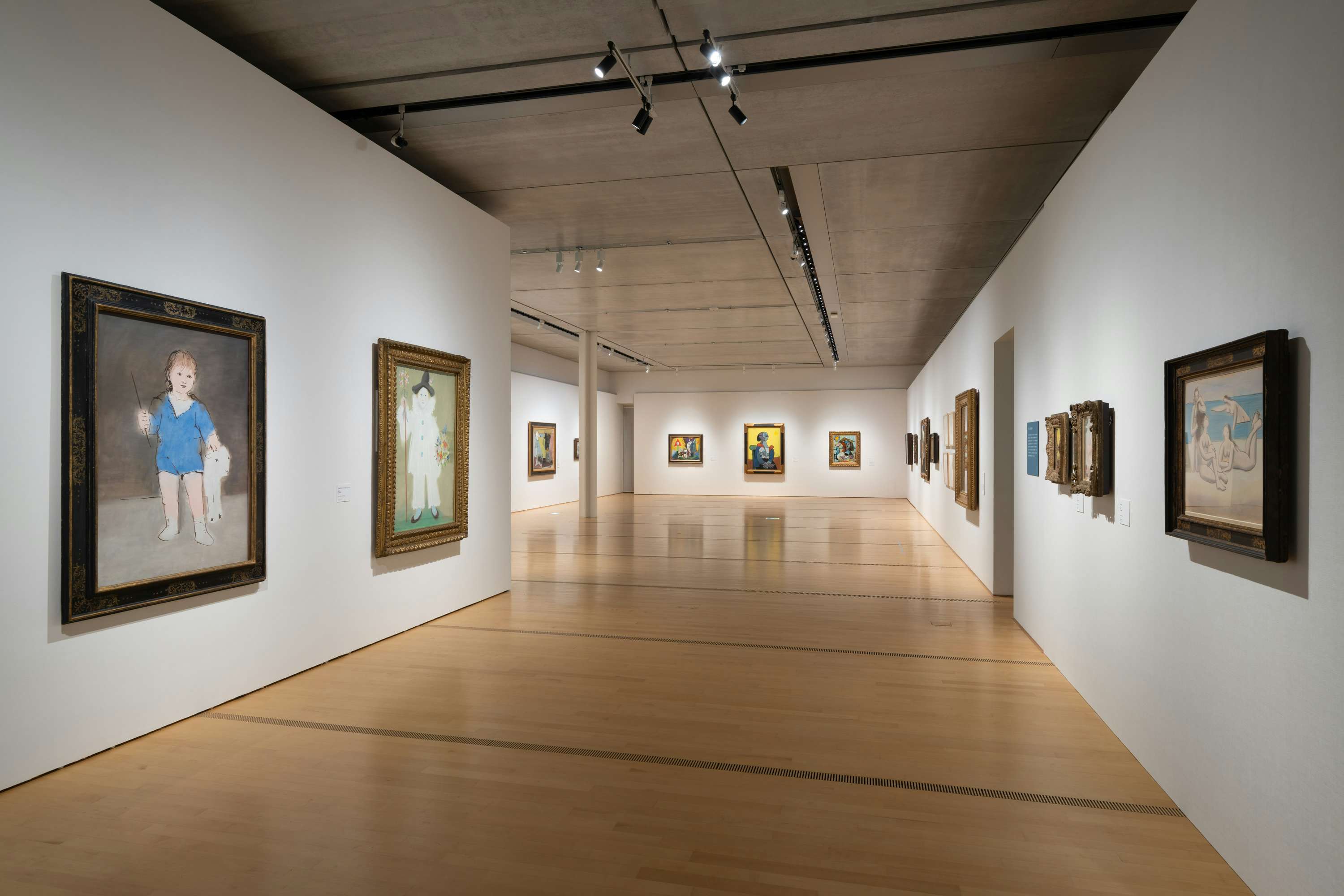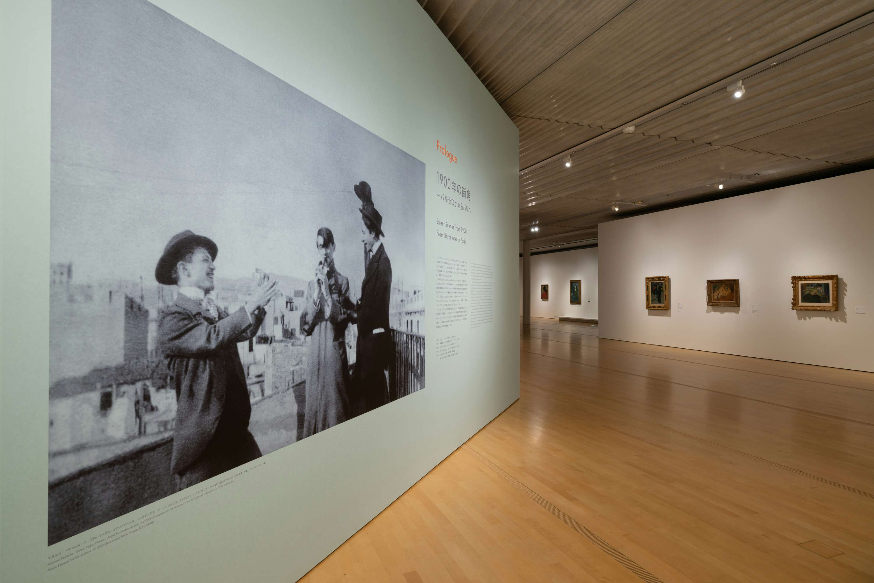 「青の時代 ―はじまりの絵画、塗重ねられた軌跡」展示風景より、左から《鼻眼鏡をかけたサバルテスの肖像》(1901)、《海辺の母子像》(1902)、《青いグラス》(1903)