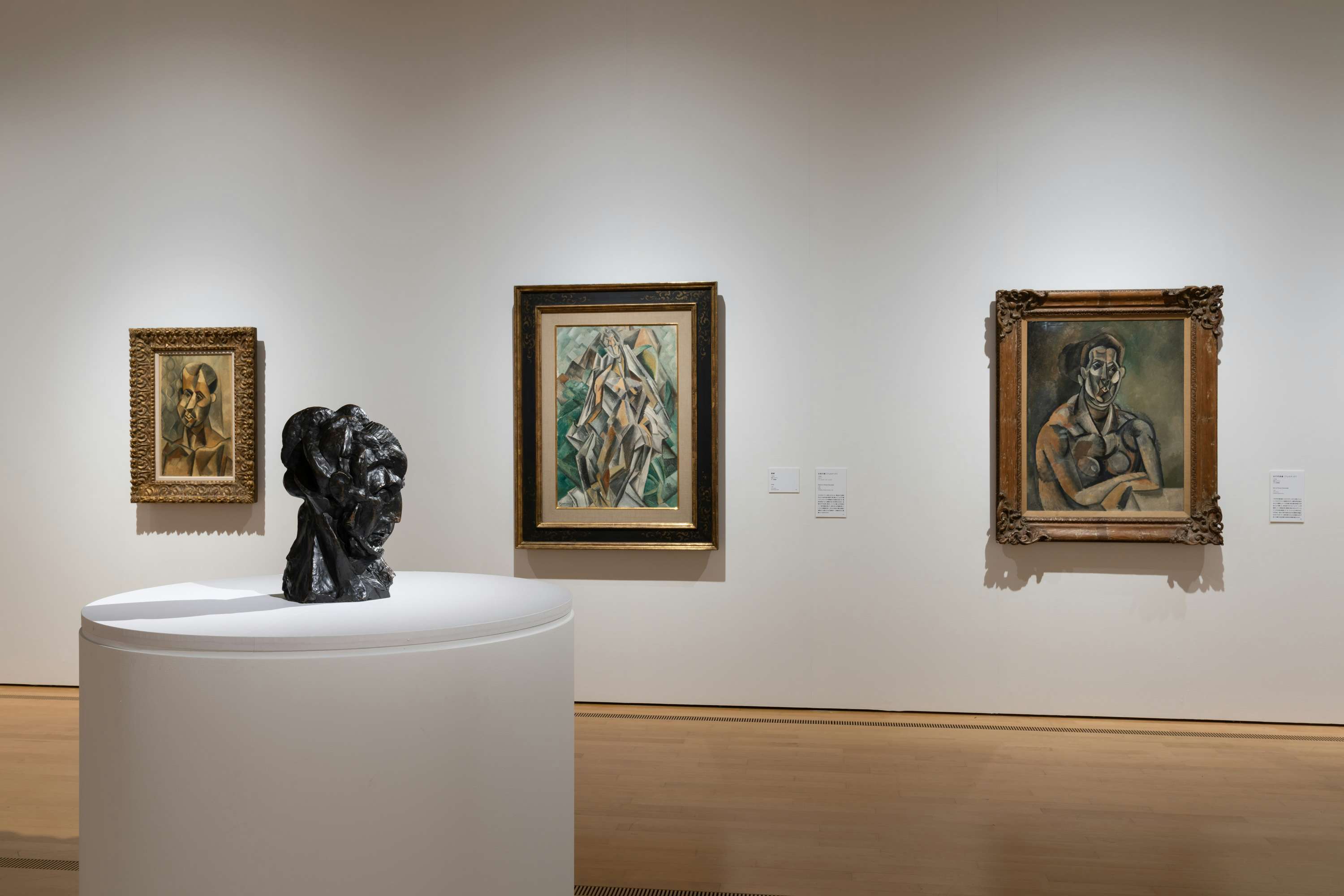 「キュビスム―造形の探究へ」展示風景より、手前が《女性の頭(フェルナンド)》(1909)。右奥が《女の半身像(フェルナンド)》(1909)