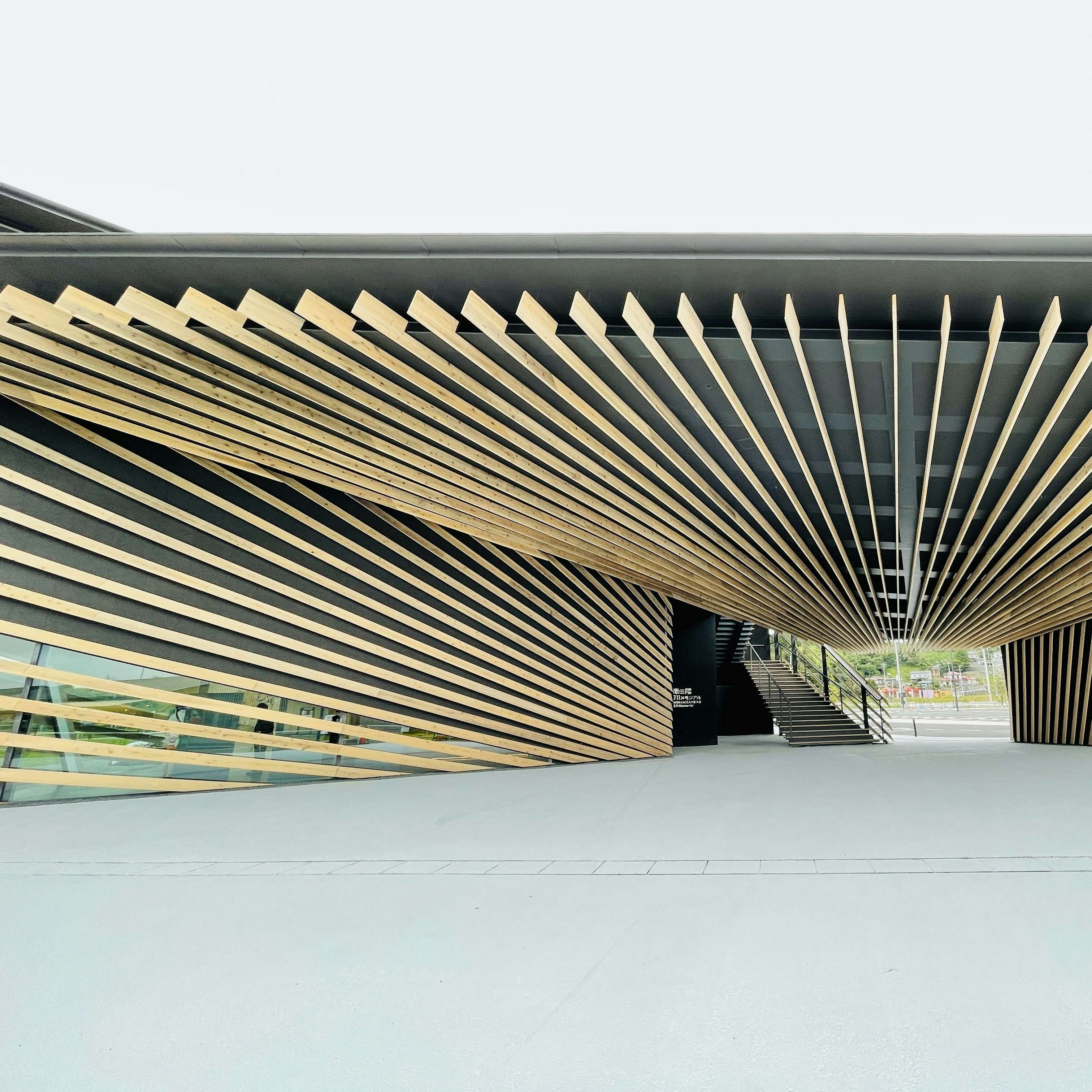 南三陸 311 メモリアルは、「南三陸さんさん商店街」(2017年オープン)などが広がる道の駅「さんさん南三陸」内部に位置する。建築設計を担当したのは、2020年10月に開通した「中橋」のグランドデザインも手がけた隈研吾建築都市設計事務所だ。建物は鉄骨造2階建て。海と山と未来をつなぐ「船」をイメージしたという大きな三角屋根と、南三陸産の木材を使ったルーバーがダイナミックな印象を与える。