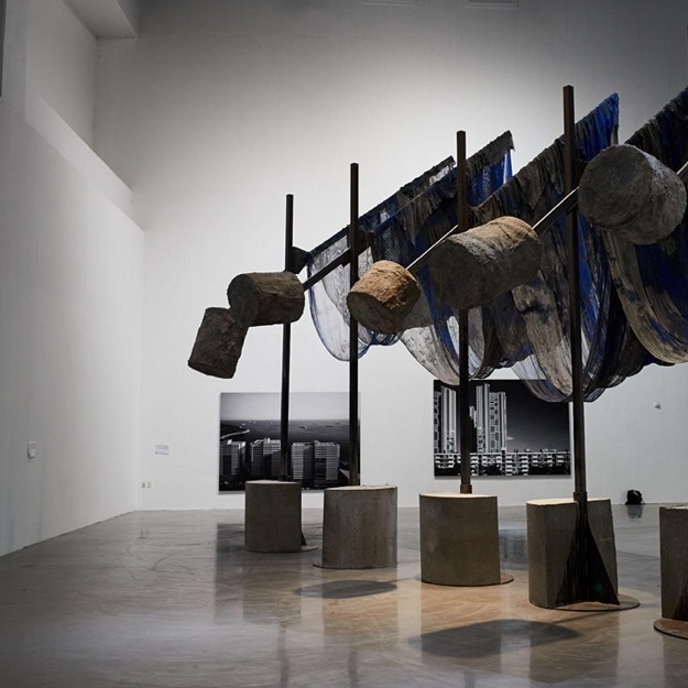 チェーンのうえには彫刻が括り付けられており、互いの自重でバランスを取り合っている。その様子は、いずれかひとつでも欠けてしまうと構造全体が崩れ落ちてしまう均衡を物語っている。また背後に見える巨大な錨は、会場である第1埠頭に放置されていた船で実際に用いられていたものだとのことだ。
