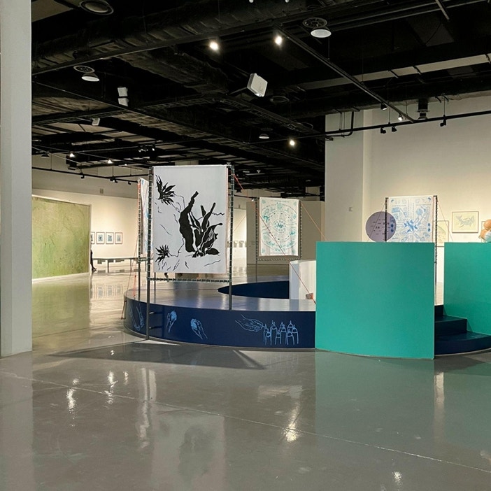 海藻が多く自生する釜山の沿岸地域に着目したRBSCは、その地形をイメージした舞台を制作。その上に近代化の過程で取りこぼされてきた「手仕事」を示すイラストや海藻のドローイングを配置し、いままさに消滅しつつある漁村コミュニティのエコシステムを表現している。