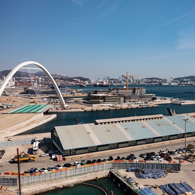 続いて訪れたのは、釜山港に設けられた会場「第1埠頭」だ。バスを降り立つと見えてくる広大な港湾風景は、東アジア最大級のハブ港として知られる釜山港の経済力を物語っている。