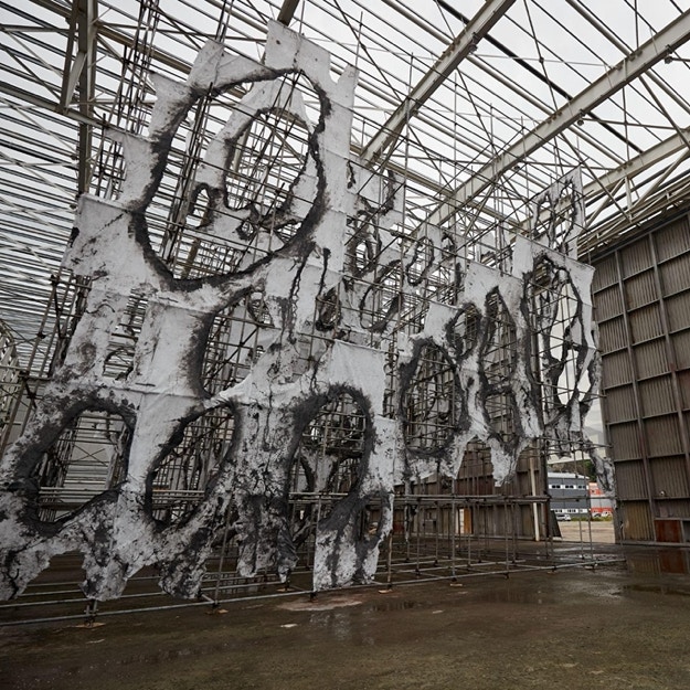 実際にこの第1埠頭には、より深く「海」について意識させられる作品が集められていた。広大な空間に入ると、すぐ目の前にはミーガン・コープ(Megan Cope)のインスタレーションが広がる。