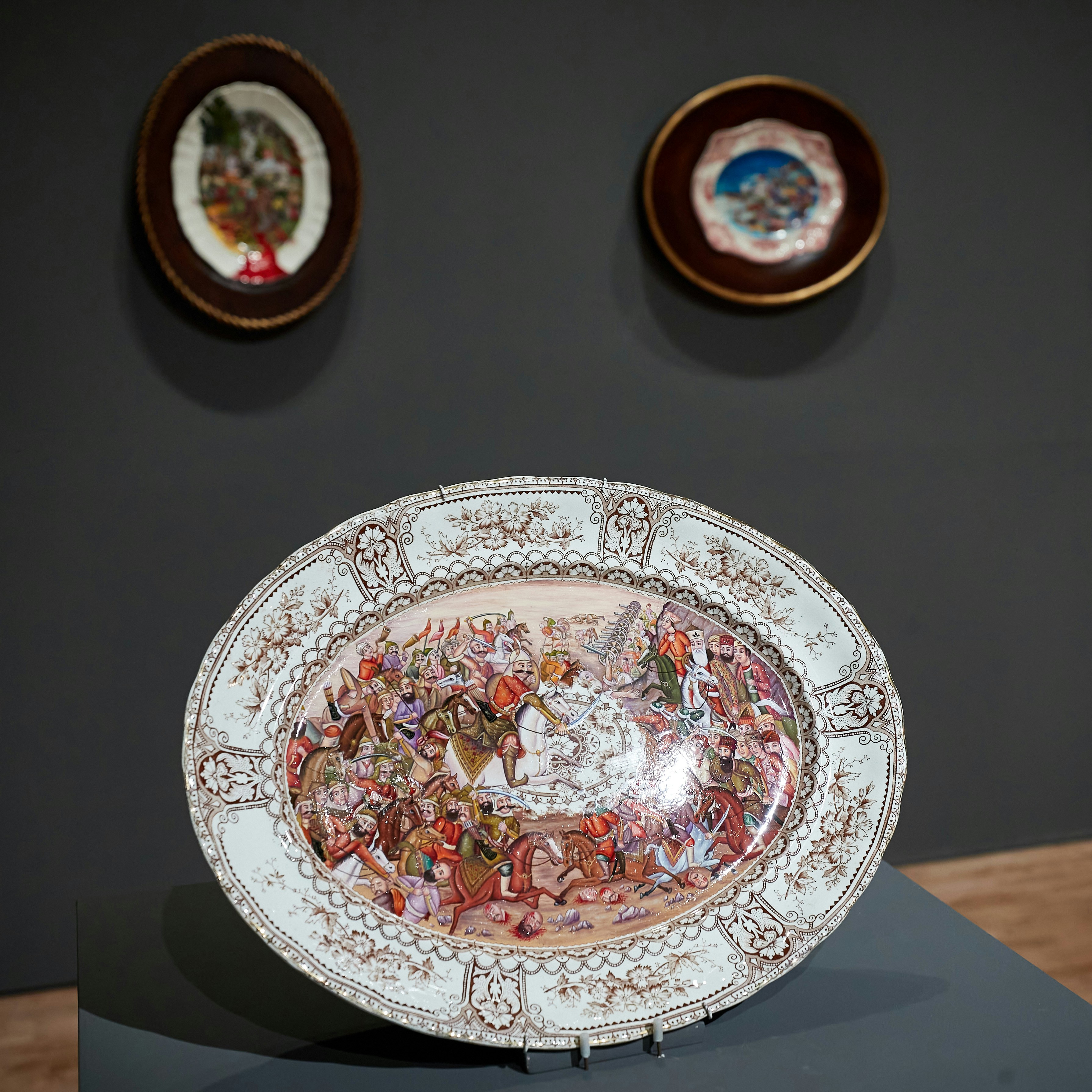 一見すると伝統的な食器のようだが、その図柄をよく見てみると、目を覆いたくなるほど暴力的な光景が描かれている。これはスレーマンがムガル帝国の細密画を参照しながら職人たちと制作した図柄で、彼女自身がパキスタンで日常的に体験している暴力の起源を問い直すものだという。