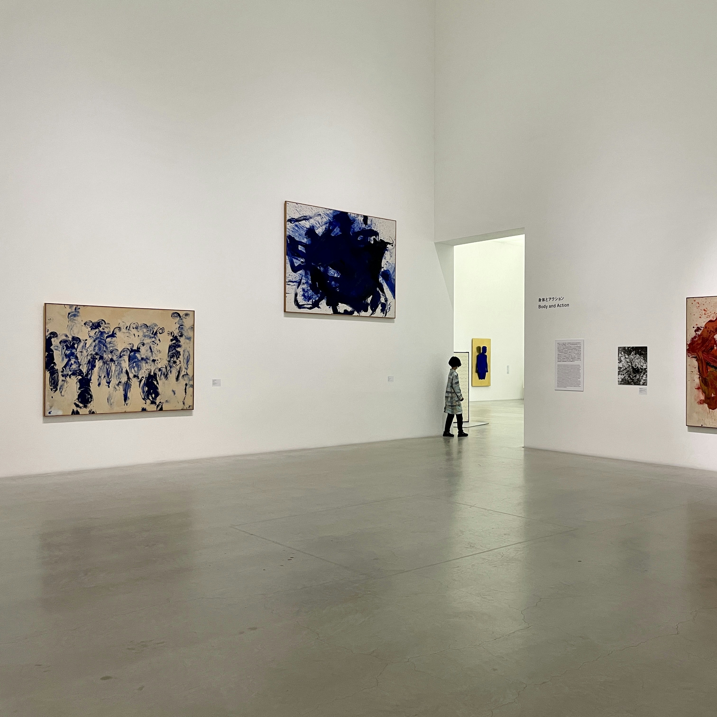 次の展示室「身体とアクション」では、IKBを塗布された生身の女性モデルをキャンバス上にかたどったクラインの代表作「人体測定」シリーズが展示。人間の「命」の痕跡を可視化したこのシリーズを、具体作家・白髪一雄の身体を使って描いたアクション・ペインティングと同じ空間に展示することにより、作家同士の創造性が共鳴し合う空間がつくりだされている。