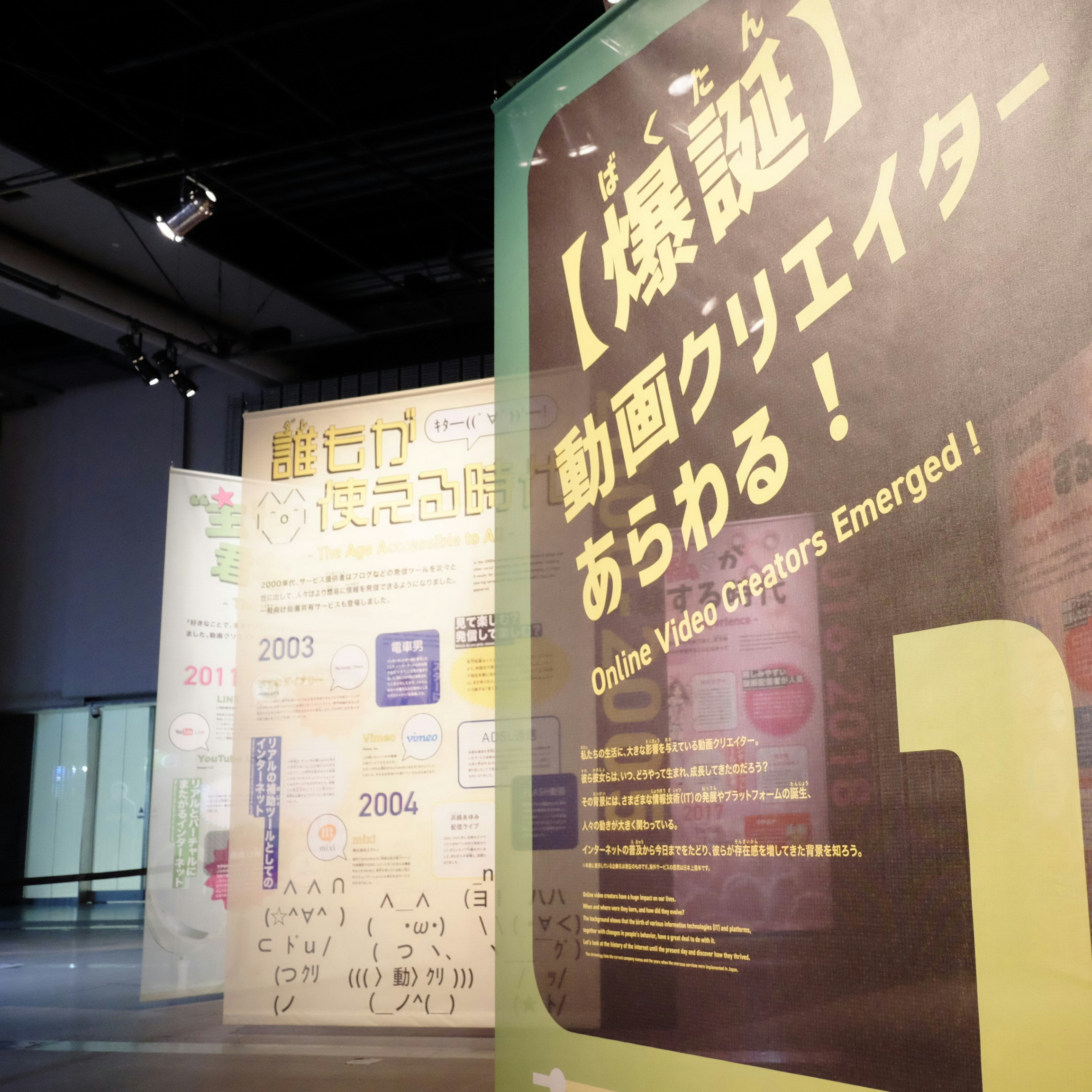 展覧会は「爆誕」「傑作」「体験」の3部構成となっている。「爆誕」では日本にインターネットが登場したとされる1995年から現代までのソーシャルメディアの変遷をたどり、動画クリエイターの台頭の経緯を探る。
