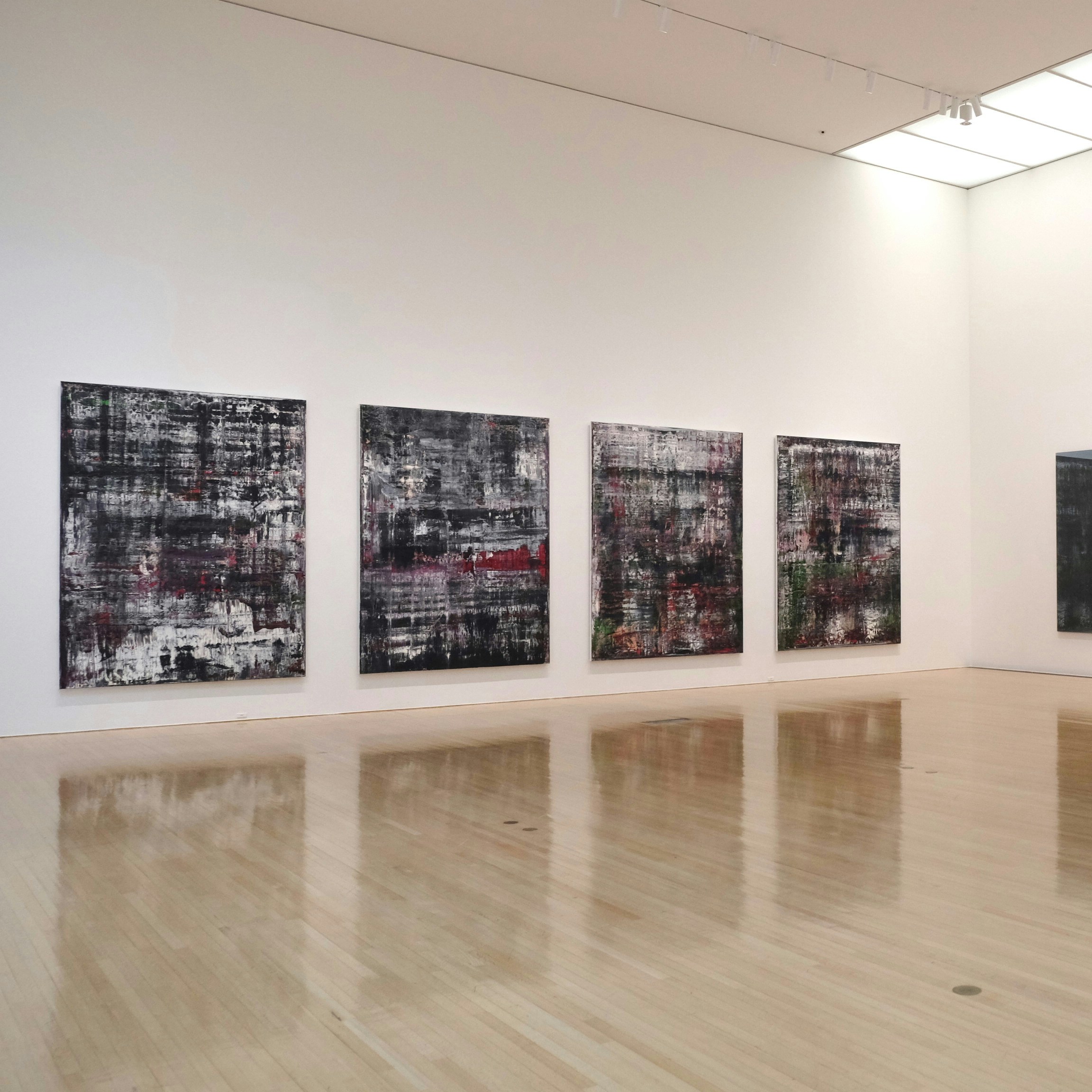 次の部屋ではリヒターの代表的な制作手法であるアブストラクト・ペインティングが登場する。自作した大きなヘラ状の道具「スキージ」を使い、キャンバスの上で絵具を引き伸ばしたり、あるいは削り取りながら制作された作品群だ。