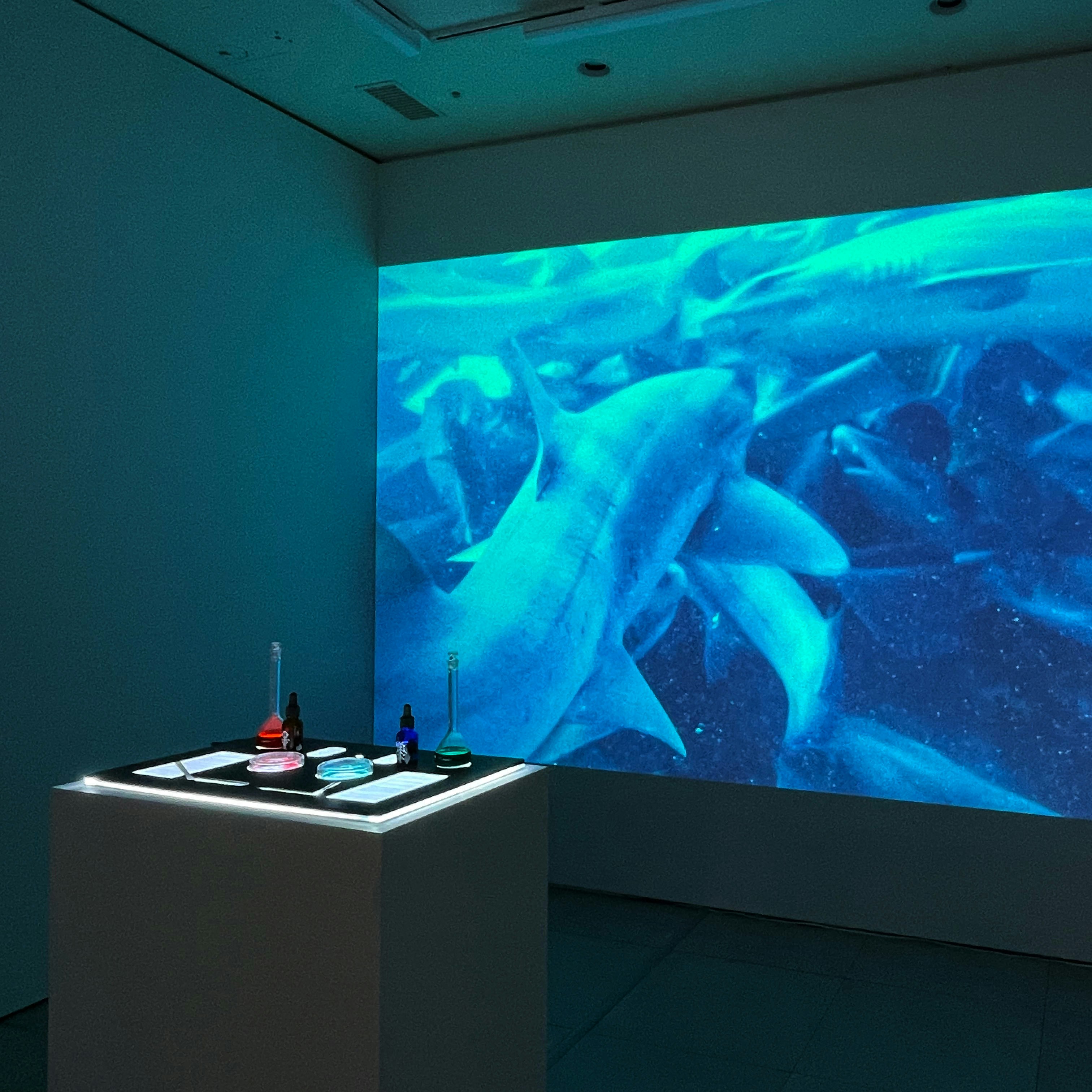 バイオアートやスペキュラティヴ・デザインなどの手法で、実験的な作品を提示する長谷川愛。有性生殖や単為生殖など、人間にとって未来のテクノロジーを使いこなすサメのメスに憧れを抱いた長谷川は、その存在に近づくべくサメのオスを魅惑する香水を企業と共同で探求、発表した。展示作品《HUMAN×SHARK》(2017)は、人間の女性がもっと強く生きやすくなるようにという願いが込められたプロジェクトであるという。