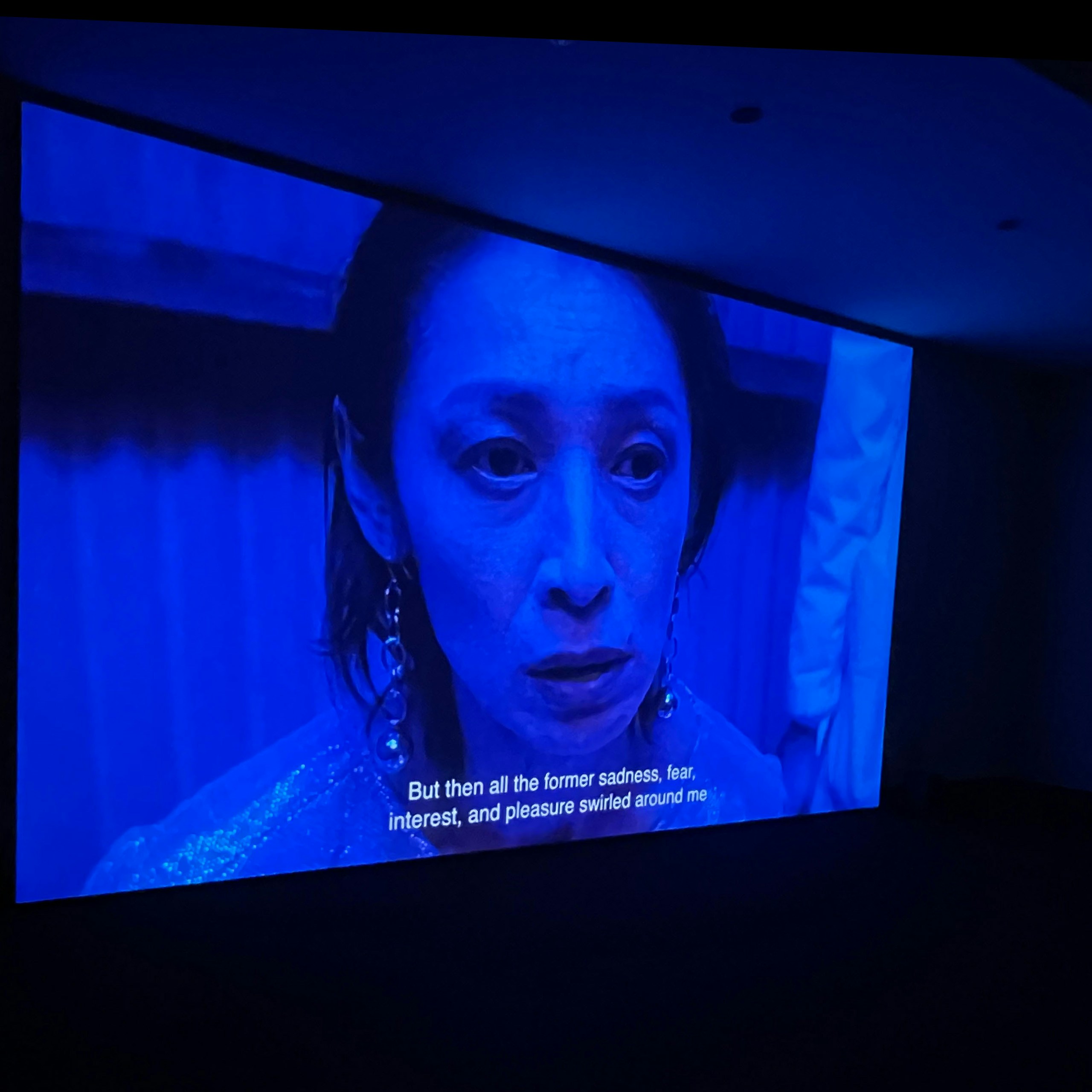隣接するビルの10階(YAU1003・1004)に展示されているのは石原海による《忘却の先駆者》(2018)と新作《Crisis》(2022)だ。《忘却の先駆者》では、オリンピックの感動を忘れないために、記憶を失わなくなる薬の服用が義務付けられた社会における、若年性アルツハイマーの母親と娘の姿を描く。いっぽうの《Crisis》は、否応なく変化する体に関する独白をとらえたもの。ともに身体制御や所有、自由をテーマに、パーソナルな物語として描かれている。