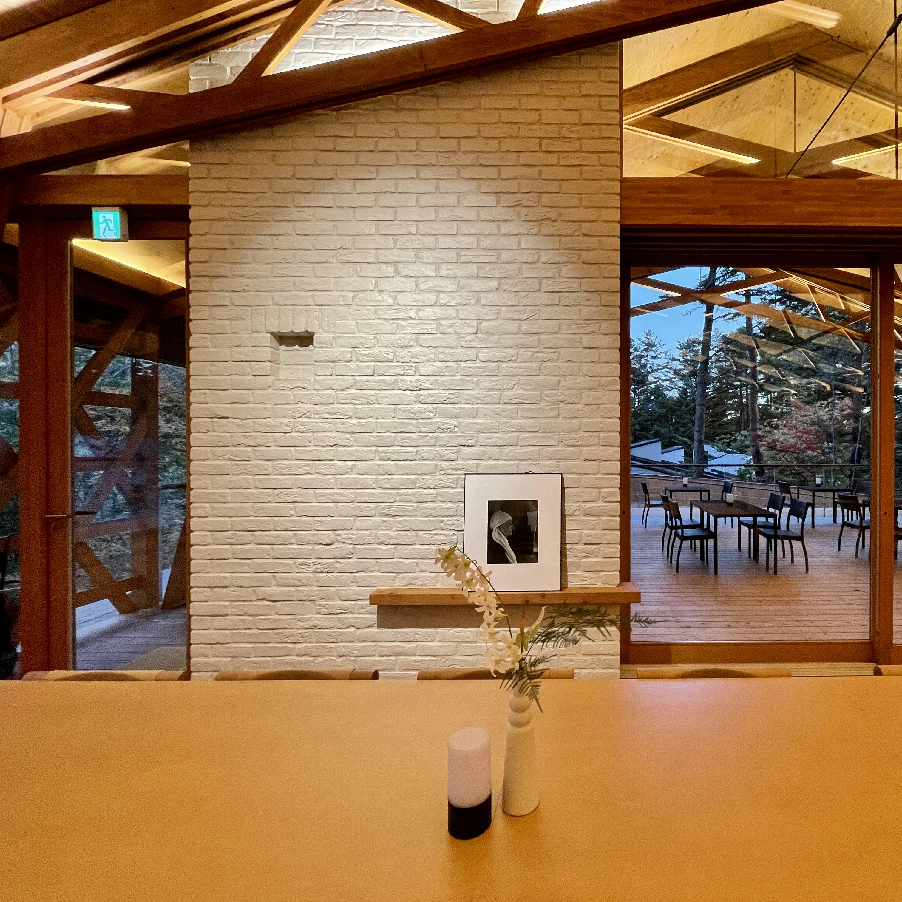 今年7月1日にオープンした2棟目「ししいわハウス軽井沢No.2(SSH No.2)」は、大きな切妻屋根が特徴的な建築。1階には12室の客室を、2階には自然と一体する大きなフォレストテラス付きのザ・レストランとバーを有する。無柱のトラス(三角形の骨組みを単位とした構造)によって生まれた広々とした空間が開放感を演出してくれる。