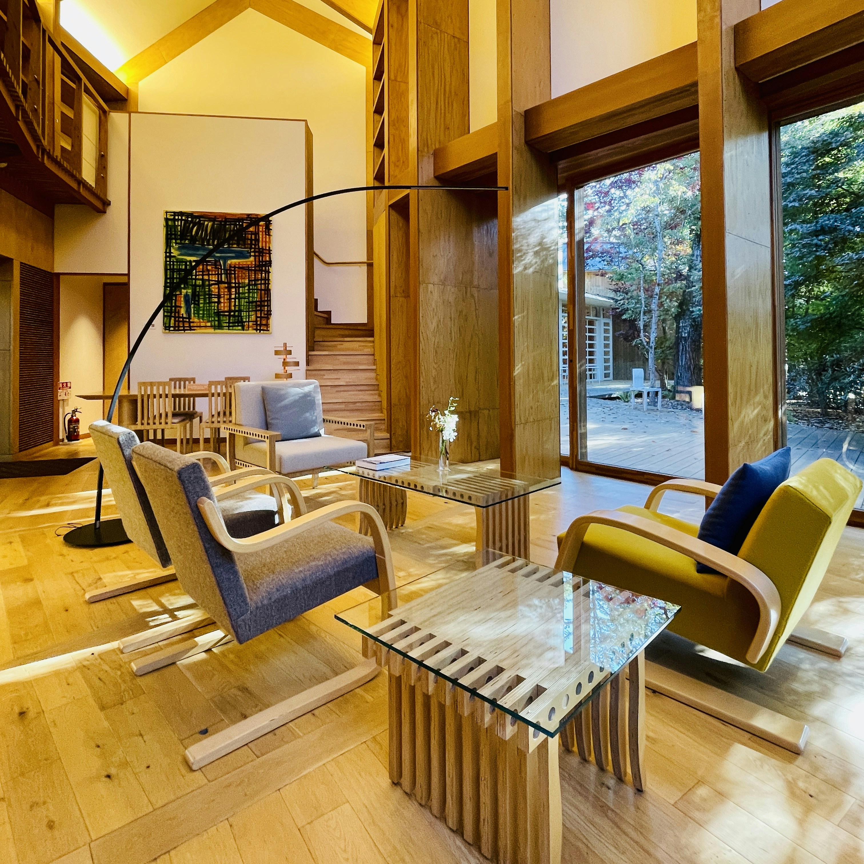 ししいわハウス軽井沢は、現代建築とデザイン、アート、そして美食と自然環境との調和を考えてつくられたリトリート施設。建物の設計はプリツカー賞受賞建築家・坂茂が手がけており、その美意識はインテリアにも及んでいる。このホテルの創設者であるHDHP GK社のフェイ・ホアンは、サステナビリティの観点から坂茂を指名したのだという。